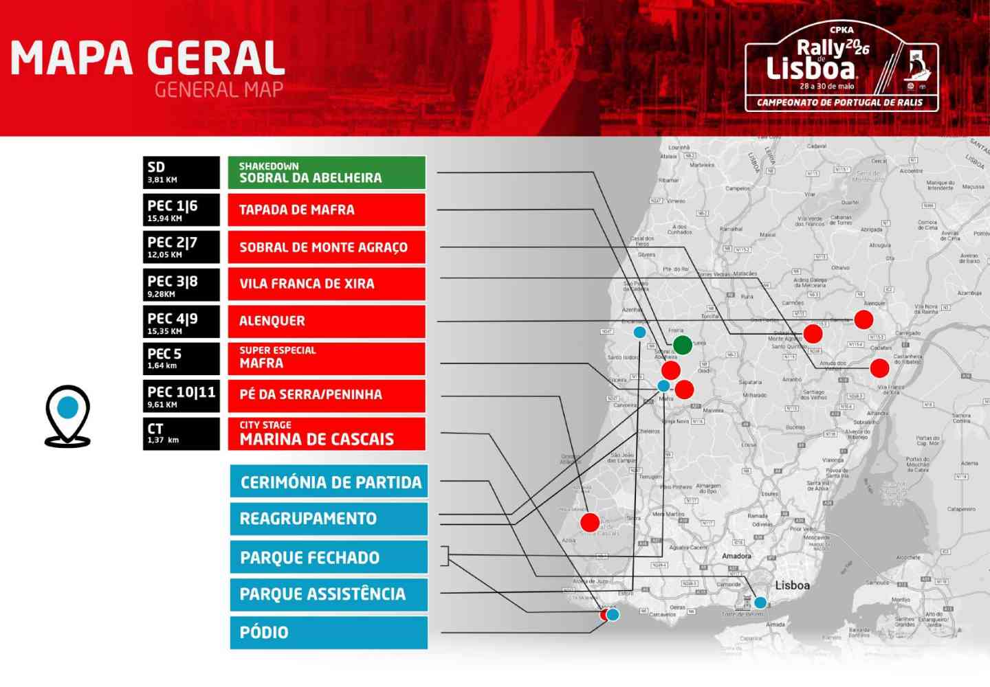 O rali manterá a sua base em Mafra, com centro operacional e parque fechado junto ao Palácio Nacional, enquanto o parque de assistência transita para a Encarnação, numa zona bem mais perto dos troços daquela zona.