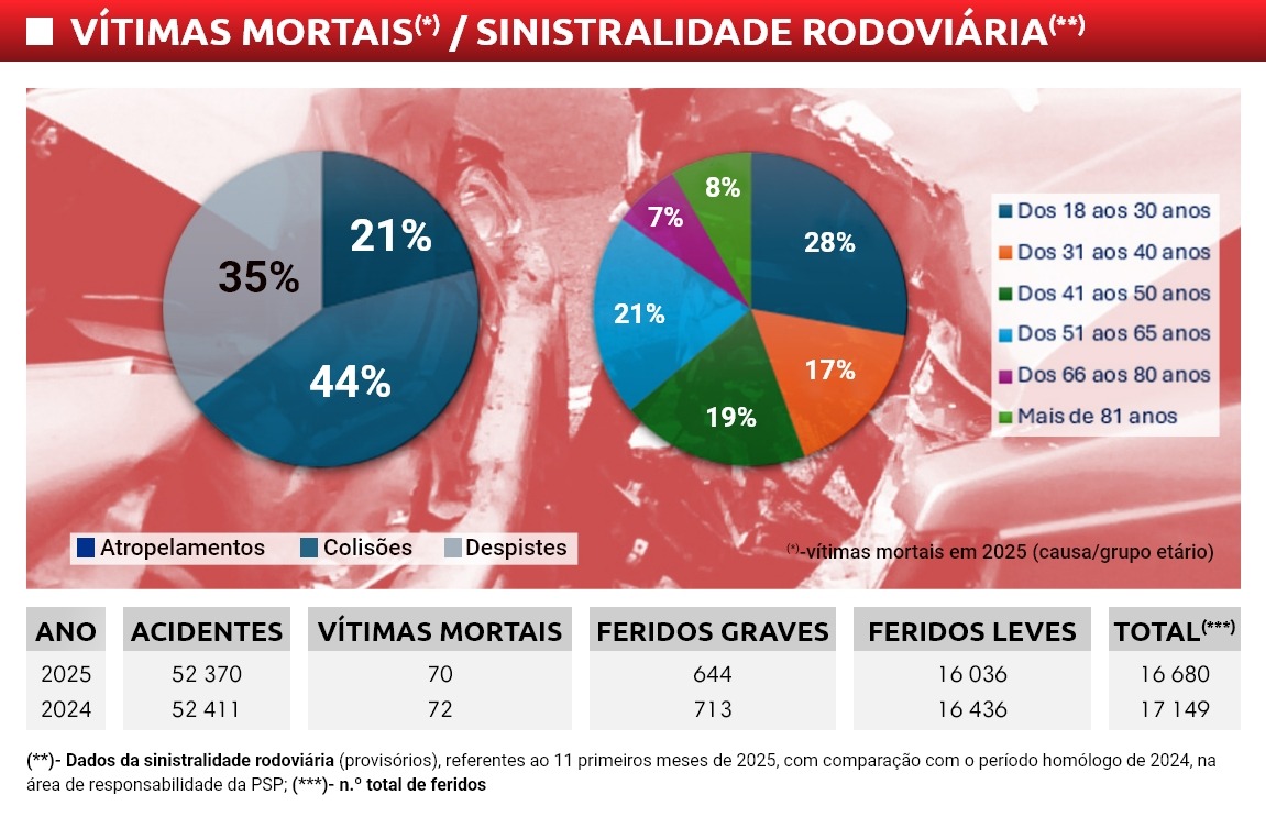 De acordo com o documento, no período em análise, e comparativamente a 2024, e apenas nas áreas de responsabilidade da PSP, o número de acidentes aumentou de 52.370 para 52.411, com mais vítimas mortais (72 em vez de 70), feridos graves (713 em vez de 644) e, ainda, feridos ligeiros (16.436 em vez de 16.036). Segundo a mesma instituição, 32 mortos aconteceram em colisões, 25 em despistes e 15 em atropelamentos, com a maioria das vítimas (28%) a pertenceram à faixa etária dos 18 aos 30 anos.