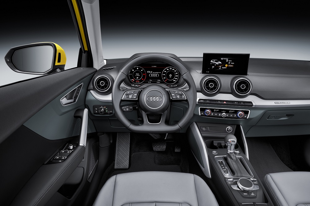 No interior, o condutor tem uma posição de condução semelhante à de um automóvel desportivo. Como é habitual na Audi, o Q2 também pode ser equipado com o sistema de entretenimento MMI touch com sistema de navegação e ecrã de 12,3 polegadas. Conexão para Apple e Android e um hotspot wifi também estão disponíveis. A bagageira tem mais de 400 litros de capacidade. O equipamento de segurança inclui travagem de emergência, deteção de peões, cruise control adaptativo, reconhecimento de sinais e de mudança de faixa e assistência de estacionamento.