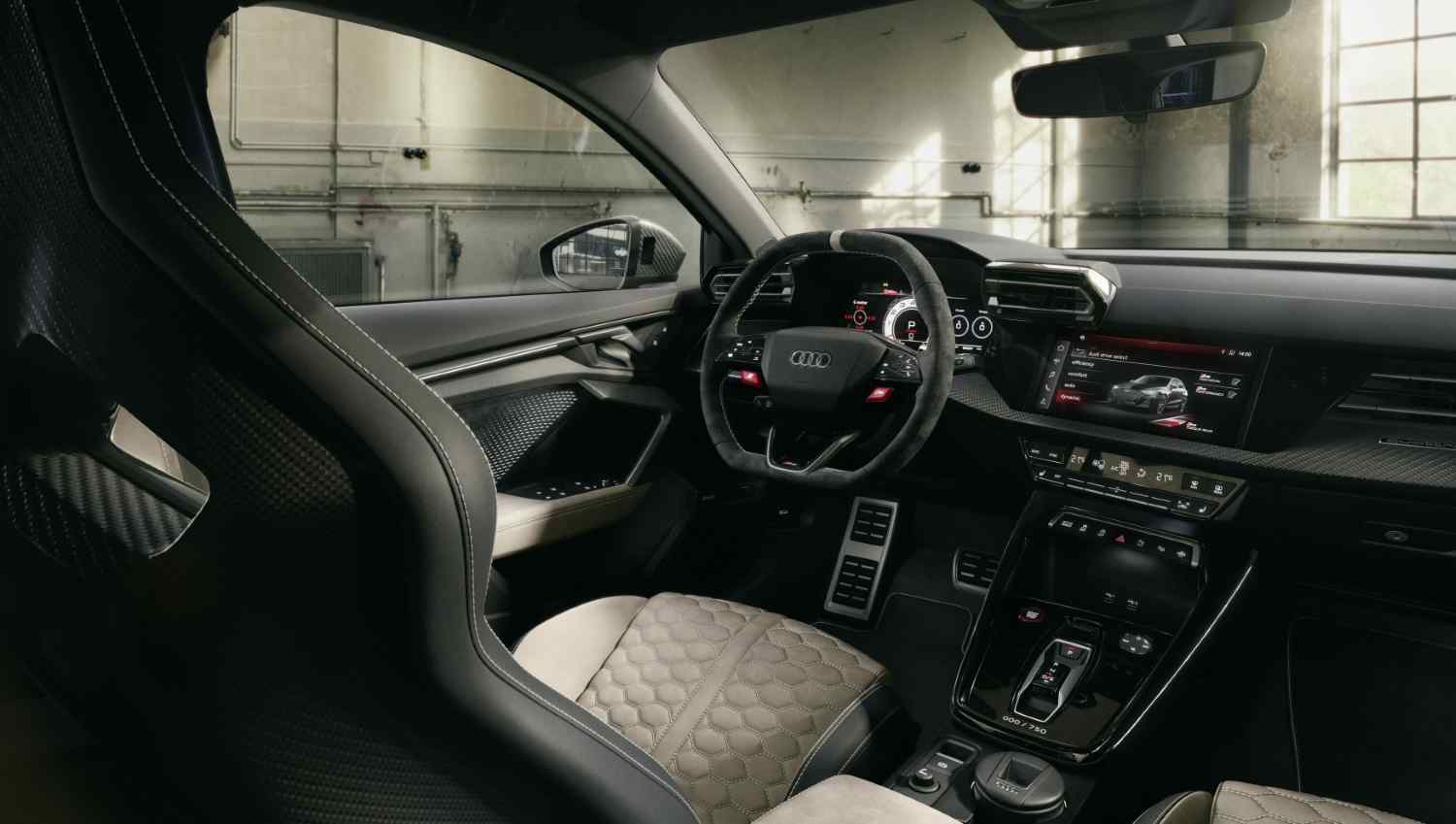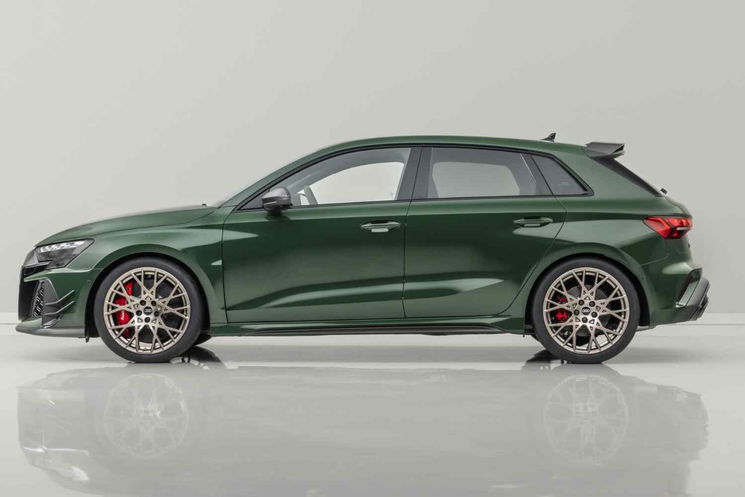 Esta versão do compacto desportivo com motor 2.5 TSI tem elementos exclusivos, como o “spoiler” dianteiro, as entradas de ar, as caixas dos retrovisores exteriores, as saias laterais e o“ aileron” com acabamento em carbono, e as jantes de 19’’ em neodímio dourado mate. Somam-se os faróis escurecidos (tecnologia LED matrix), que “escondem” um pormenor: ao travar e destravar este Audi RS 3, os segmentos de luzes iluminam-se no padrão “1-2-4-5-3”, o que faz a ligação à ordem de ignição da mecânica de 5 cilindros!