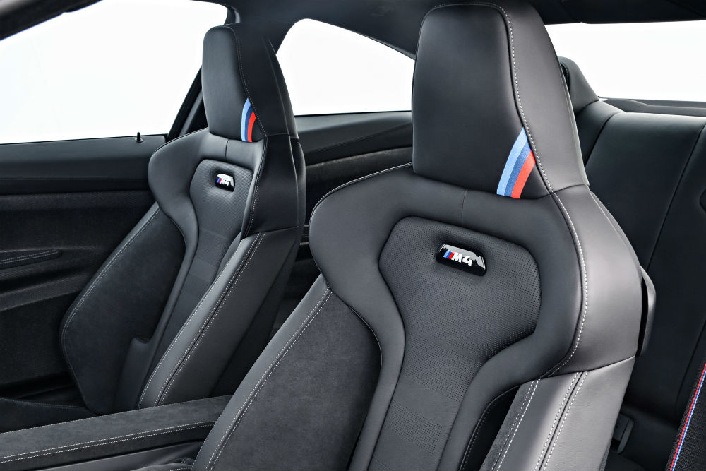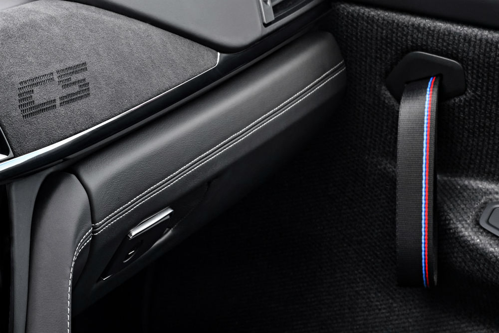 Uma frente proeminente, com luzes LED, três generosas entradas de ar na zona inferior e um novo splitter dianteiro em carbono específico da versão atribuem-lhe um rosto apetecível. As pinças de travão M de quatro pistões à frente e dois atrás sobressaírem nas jantes. Nota para a redução de peso, com o tejadilho, spoiler da tampa da mala, a par do difusor e lábio dianteiros serem em plástico revestido a fibra de carbono. O facto de a BMW ter recorrido a vários elementos para reduzir o peso, faz com que este M4 CS tenha menos 32 kg de peso total face ao M4 ‘normal’. Os novos grupos óticos na traseira com OLED (Organic Light Emitting Diode) são o complemento de um conjunto visualmente aliciante, exterior e interiormente e, calculamos… ao volante.