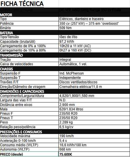 Ponto em que registámos maior diferença entre as duas versões foi o dos consumos: a versão FWD Long Range mostrou-se bem mais poupada (12,2 kWh/100 km) do que a AWD Long Range (19,8 kWh/100 km), embora seja justo apontar que o percurso deste último apelou mais a uma condução desportiva.