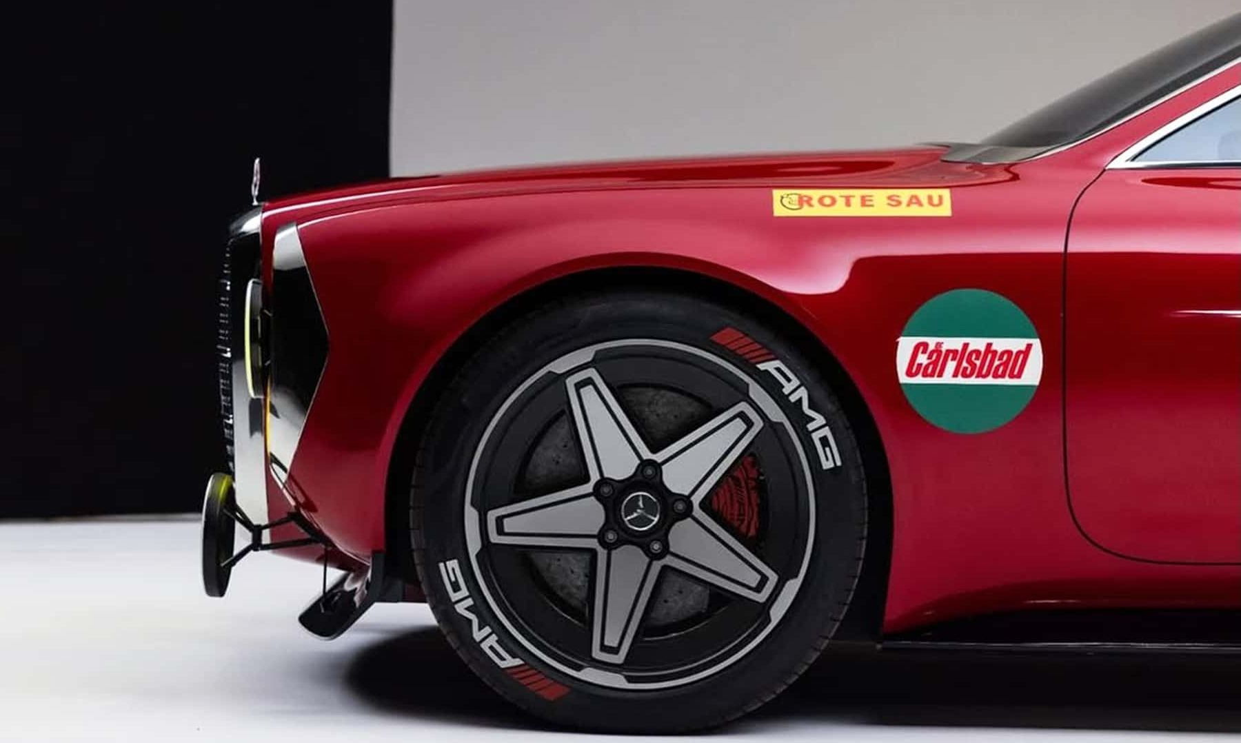 O novo “Rote Sau” (também vermelho) repete as formas arredondadas do original, nomeadamente na secção traseira da carroçaria, e a linha de tejadilho garante-lhe uma aparência muito desportiva, “musculada” e robusta. A dianteira é dominada por grelha enorme cromada e perfurada, e por grupos óticos, também cromados, em que sobressaem os gráficos em estrela, que remetem para o logótipo da marca. Na traseira, faixa luminosa horizontal secundada por anéis LED em posição muito baixa garantem uma aparência muito “agressiva”. As jantes também são inspiradas nas utilizadas pela AMG no carro original.