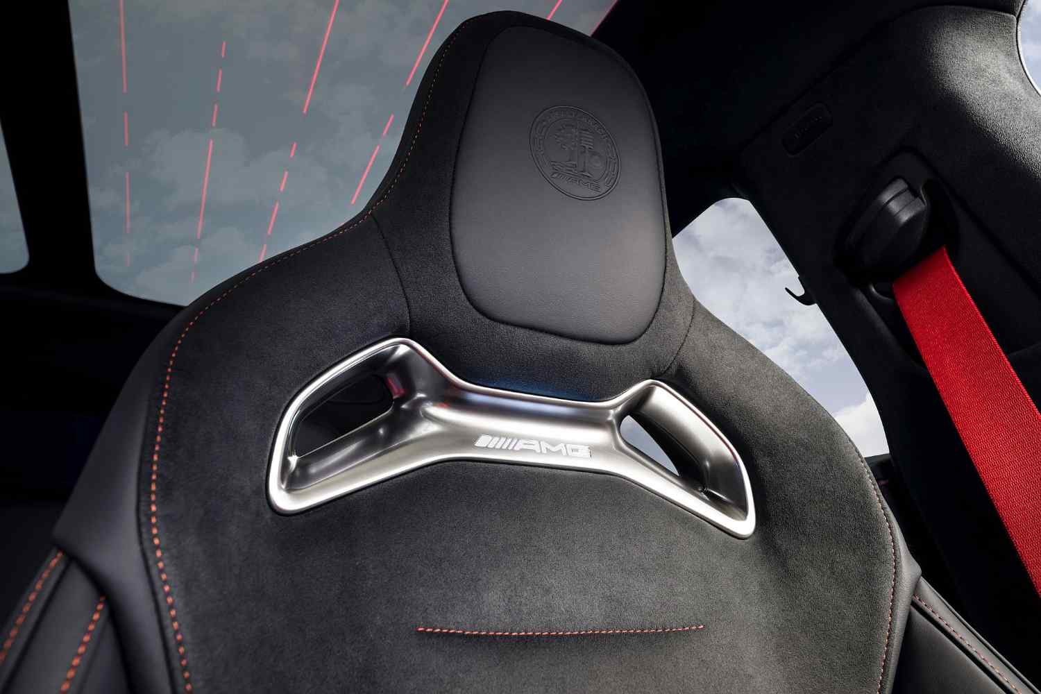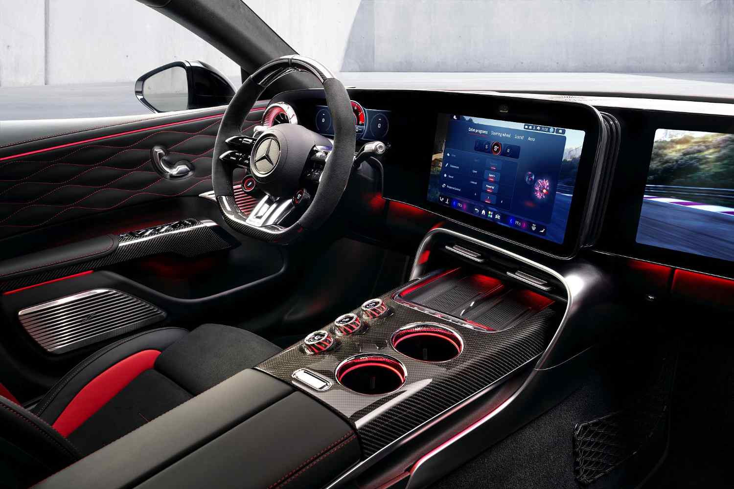 No volante AMG Performance, de base plana, a marca recupera os comandos físicos para algumas funções, mas a maioria dos controlos são hápticos. O equipamento admite personalização em termos de revestimentos (entre as opções, pele ou combinação de fibra de carbono e Alcantara”. Há, ainda, patilhas para comando manual-sequencial da caixa de velocidades e dois seletores inferiores baseados em ecrãs LCD para ajuste direto e rápido de algumas das funções, como o amortecimento ou os modos de condução.