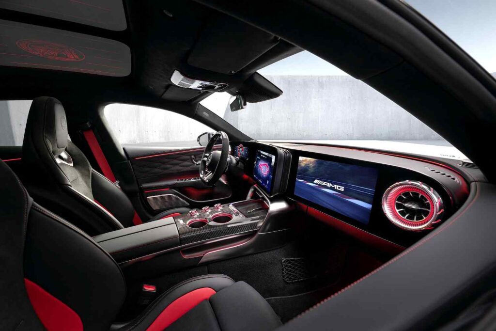A Mercedes-AMG, para o GT 4 portas Coupé novo, promete interior com desenho evocativo dos “cockpits” dos carros de competição, com a instrumentação (monitor de 10,2’’) e o ecrã do sistema multimédia (14’’) dispostos de forma panorâmica e orientados para o condutor. Este conceito pretende melhorar o controlo de funções e a facilidade de leitura durante a condução.