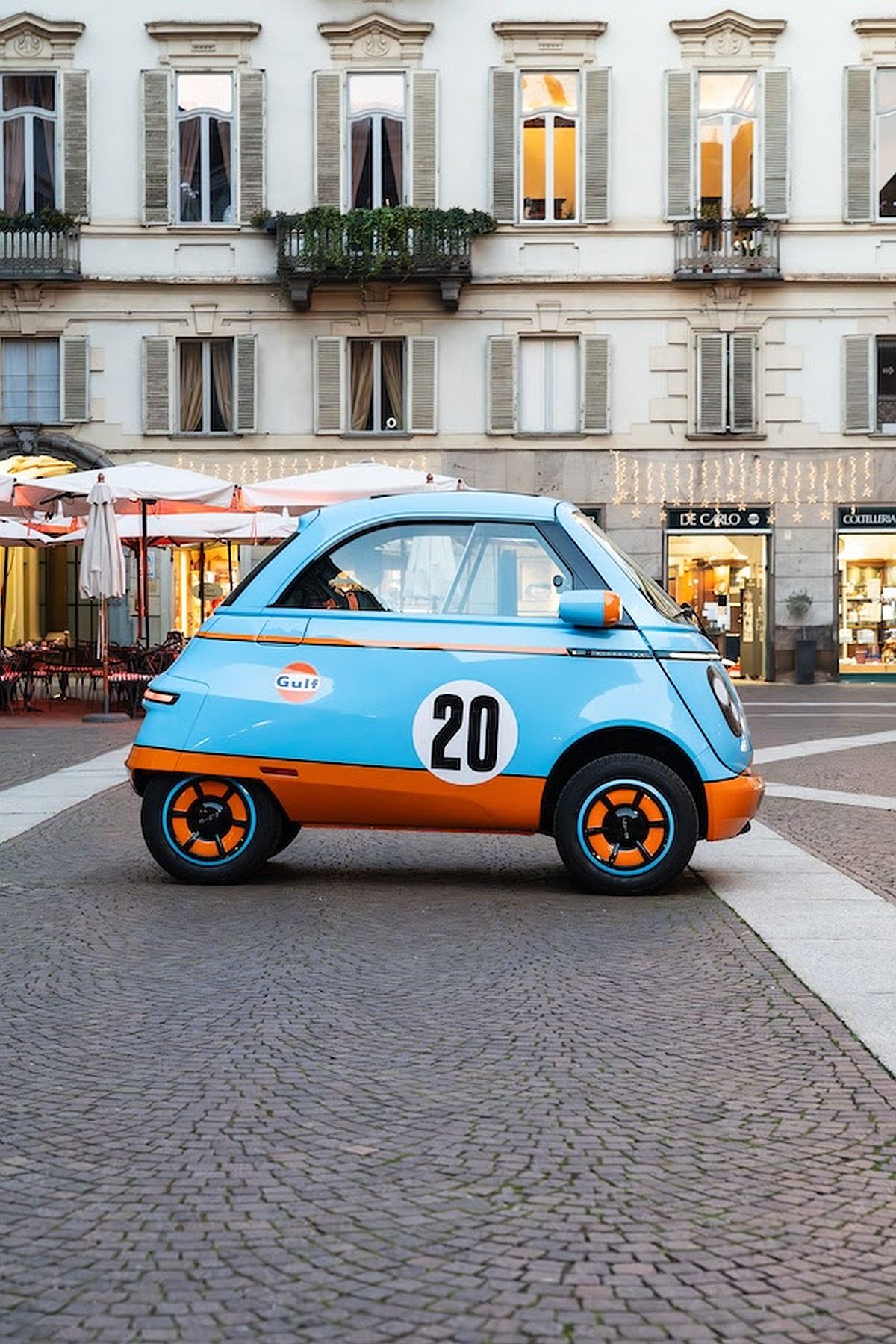 O Microlino Tributo Porsche 917K, projeto especial, homenageia o carro da marca alemã vencedor das edições de 1970 e 1971 das 24 Horas de Le Mans. O quadriciclo, recorda-se, tem motorização elétrica e só 17 cv! Produzido para Sara Levy, filha de Andrea Levy, piloto e Presidente do Salão de Turim, Itália, esta unidade única tem decoração inspirada no azul e no laranja da Gulf. O 917K com o número 20 foi tornado famoso por Steve McQueen, no filme “Le Mans” de 1970.
