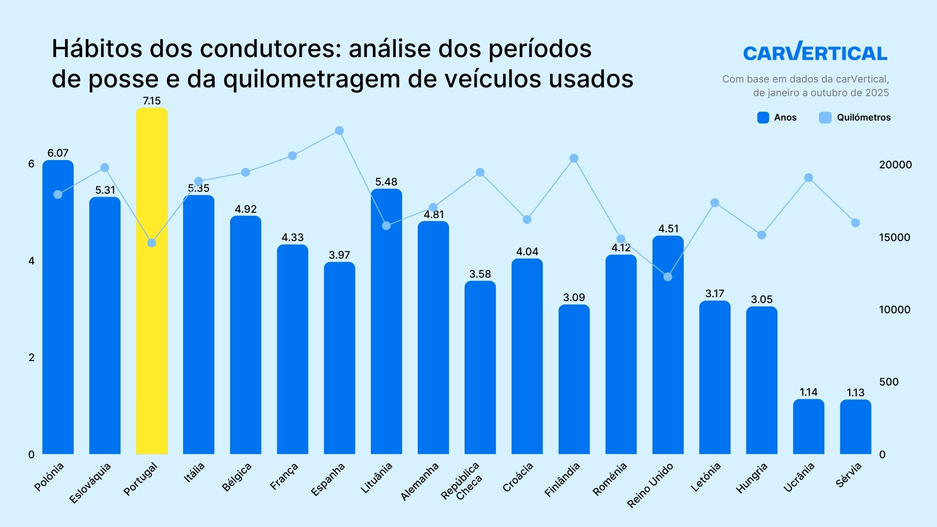 De acordo com os dados recolhidos pela carVertical, em Portugal um único proprietário conduz, em média, 108 256 km antes de vender o automóvel, um valor bastante superior à média europeia de 75 928 km. Apenas a Polónia e a Eslováquia apresentam números ligeiramente superiores.