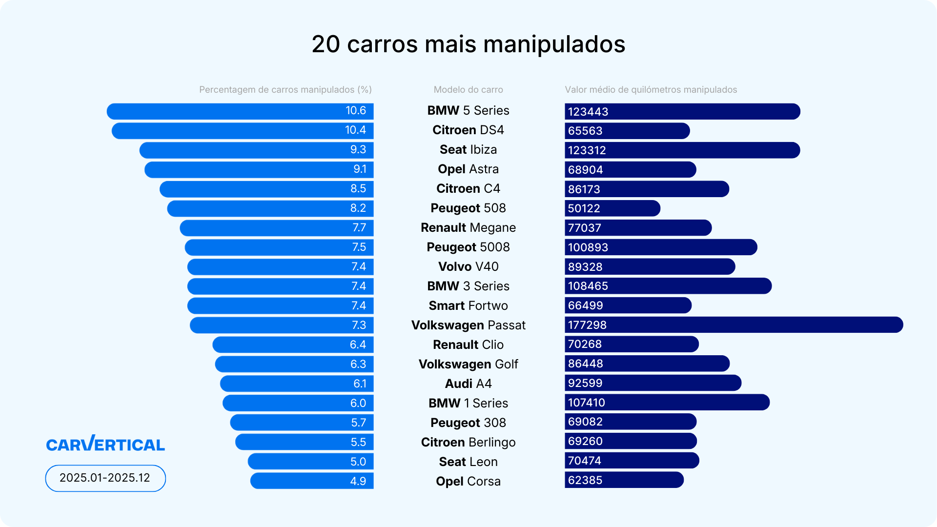 De acordo com a análise, o BMW Série 5 lidera a lista dos modelos mais frequentemente adulterados em Portugal, com 10,6% das viaturas verificadas a apresentarem manipulação da quilometragem. Em média, estes veículos registaram uma redução de 123 443 quilómetros. Seguem-se o Citroën DS4 (10,4%), com uma diminuição média de 65 563 quilómetros, e o Seat Ibiza (9,3%), cuja quilometragem foi reduzida, em média, em 123 312 quilómetros.