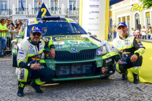 Ao volante de um carro novo, o Skoda Fabia R5, Miguel Correia e Pedro...
