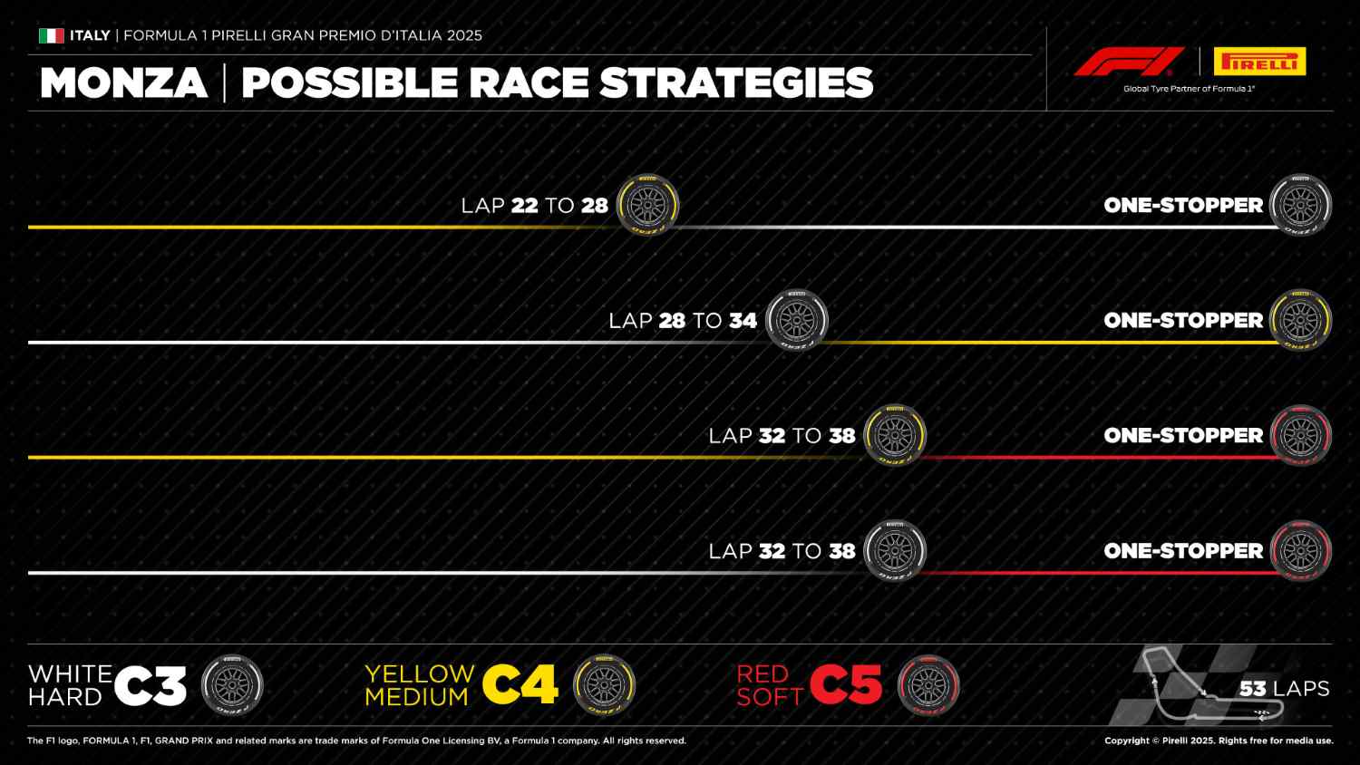 A janela ótima para a paragem nas boxes situa-se entre as voltas 22 e 28, o que pode parecer um pouco tardio, mas Monza não é uma pista para paragens antecipadas. As ultrapassagens prometem ser difíceis. Quanto menores as asas traseiras, menos eficaz se torna o DRS (simplesmente não há arrasto suficiente para o DRS reduzir) – e as asas traseiras em Monza são, de facto, muito pequenas. Noutros circuitos, isto seria um convite para o ‘undercut’ por parte de carros que seguem de perto os seus rivais, mas outro fator em Monza é que a degradação dos pneus parece ser muito baixa, o que anula a vantagem de um pneu novo.