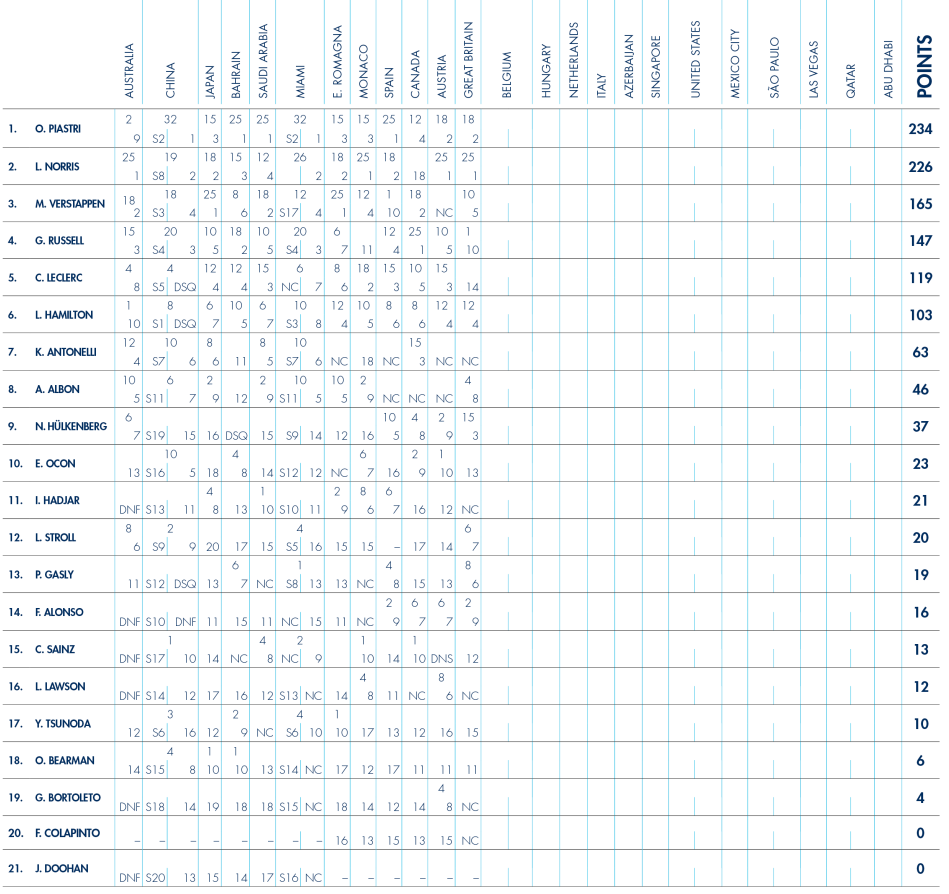 Oscar Piastri lidera com 234 pontos, logo seguido pelo seu colega de equipa, Lando Norris, com 226 pontos — uma luta interna intensa que demonstra a superioridade da McLaren nesta fase da temporada, isto numa altura em que Norris recuperou bons pontos nas últimas duas corridas.