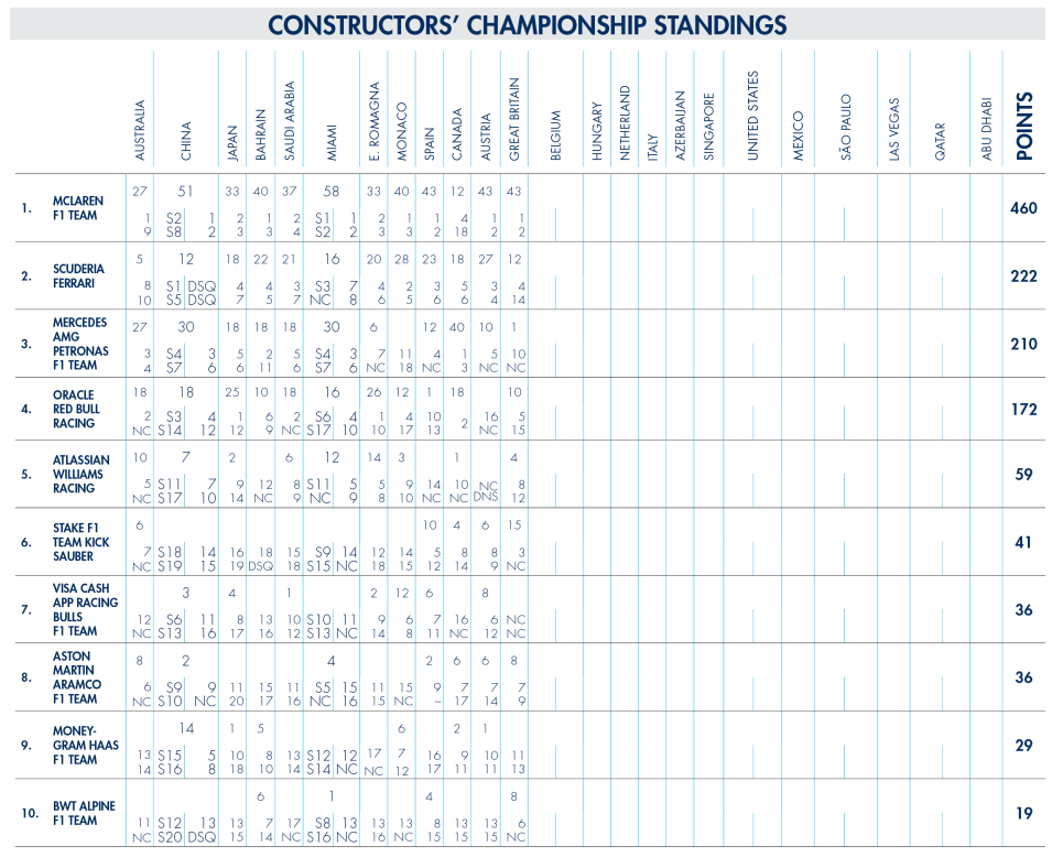 Esta superioridade advém da regularidade e desempenho de Piastri e Norris, que praticamente dividem as vitórias e posições cimeiras.