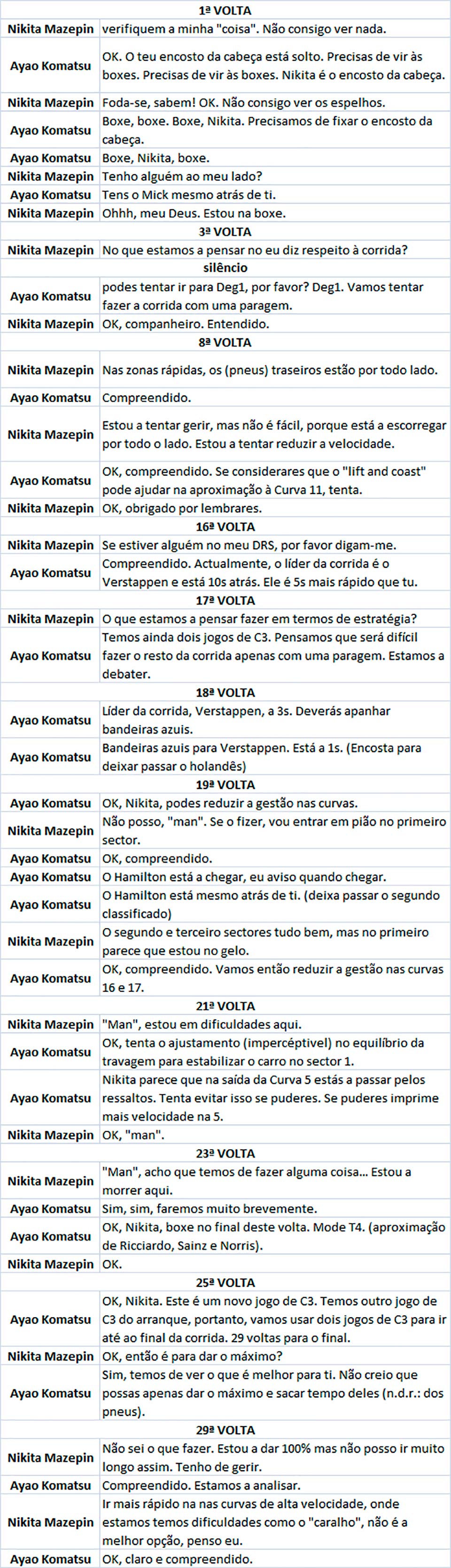 Foi uma corrida difícil para Mazepin, mas na adversidade o russo mostrou compreensão e uma abordagem positiva que se coaduna pouco com o rótulo que lhe tem sido colocado. Não será um anjinho e tem defeitos como todos, sendo difícil que algum dia esteja numa equipa capaz de lhe poder permitir lutar por grandes resultados, mas também não é o “diabo” que querem fazer querer. Pelo menos, a avaliar pelas comunicações rádio…