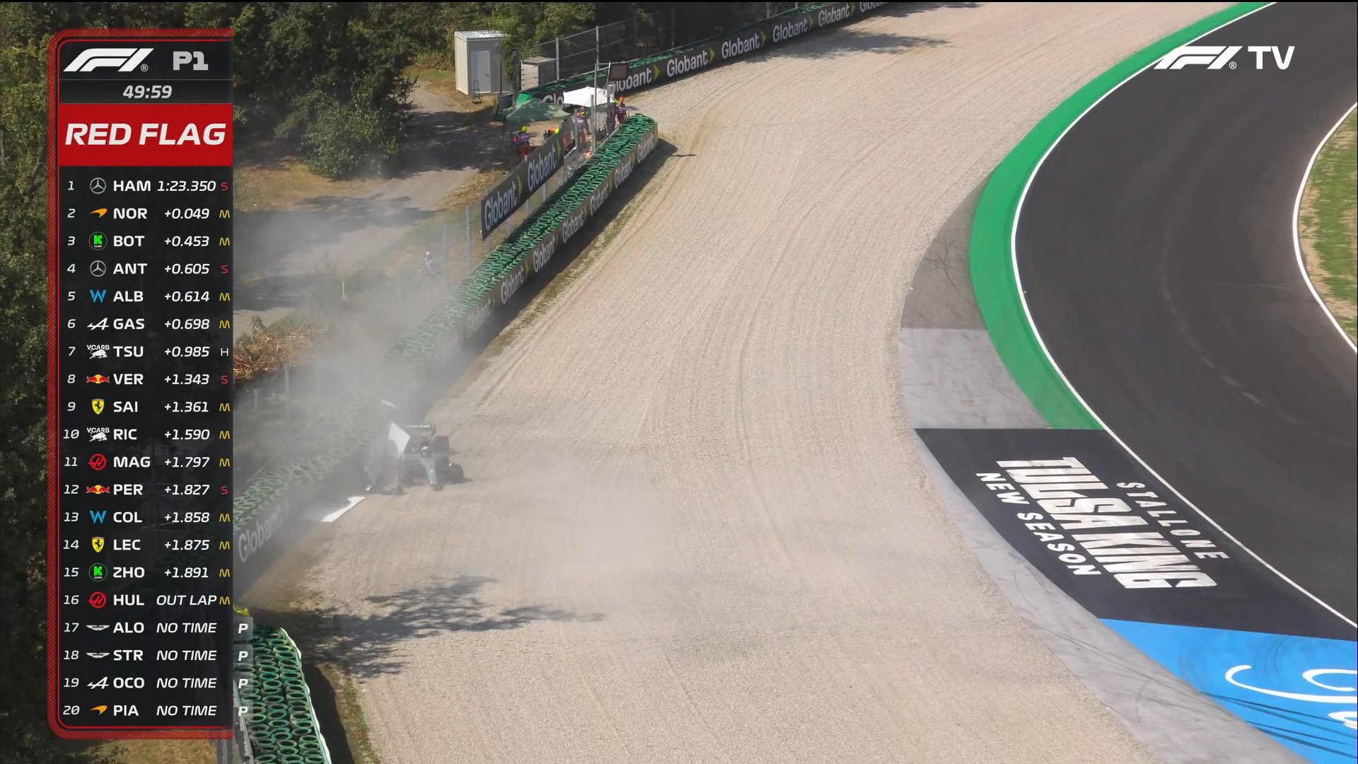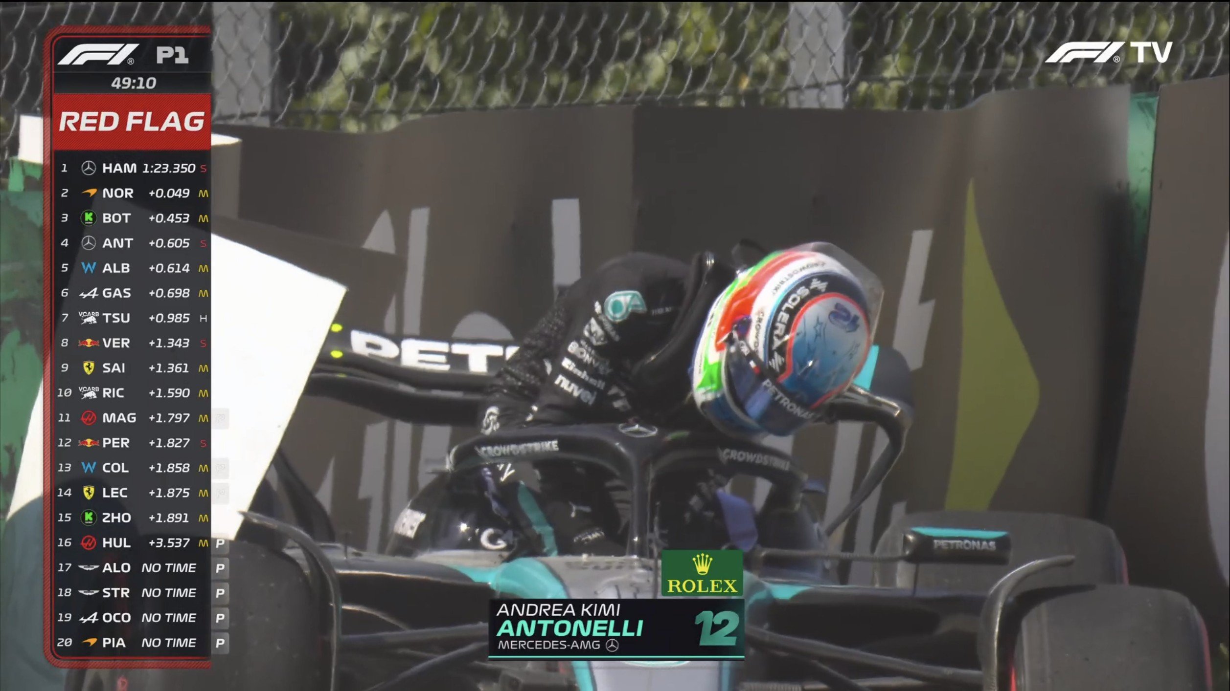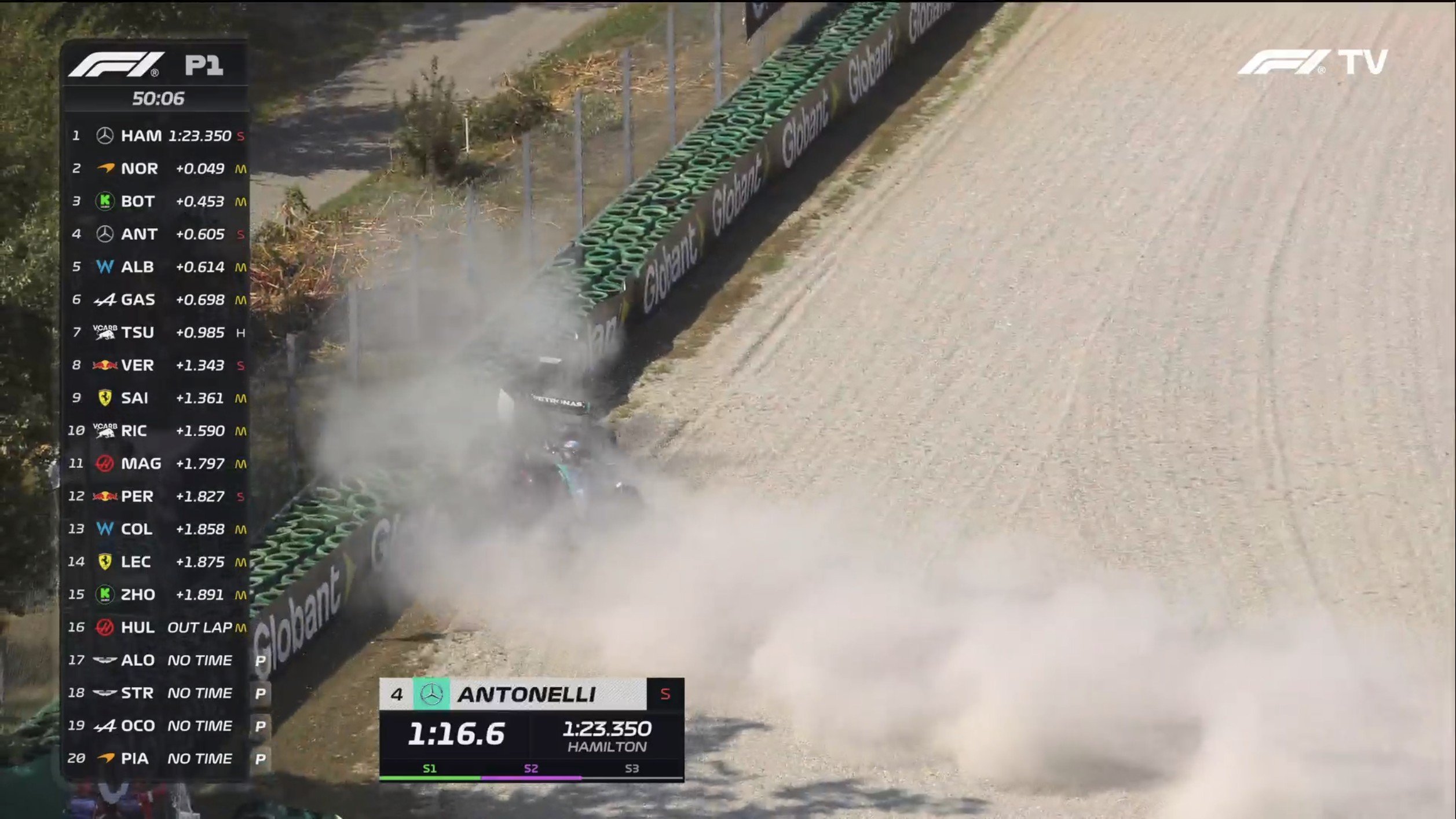 Começou bem, mas acabou mal e depressa. Andrea Kimi Antonelli, sob forte pressão e escrutínio, foi para a pista para se estrear pela Mercedes, em casa, perante os seus compatriotas. Começou da melhor maneira com o melhor tempo, mas 12 minutos depois do arranque da sessão, o piloto da Mercedes não evitou uma saída de pista na Parabolica, danificando o carro com alguma severidade. A sessão foi interrompida e o piloto saiu do carro sem problemas aparentes.