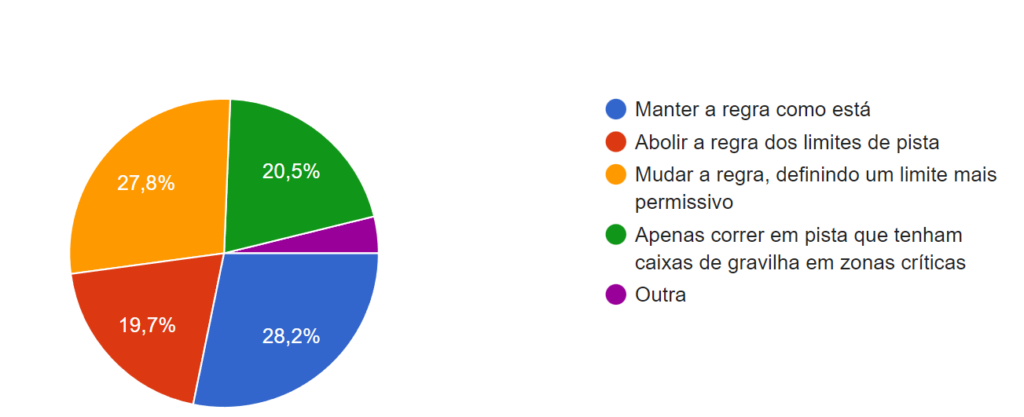 Na sondagem feita pelo AutoSport, as opiniões dividem-se. 28,2% dos leitores que votaram consideram que a regra deve ser mantida como está, mas 27,8% acreditam que os limites devem ser mais permissivos. 20,5% defendem que se deve correr apenas em pistas que tenham caixas de gravilha em zonas especificas e 19,7 querem simplesmente a abolição da regra. Foi uma votação equilibrada, mas a maioria olha para a regra atual como uma solução boa, sendo que parte dessa maioria defende apenas uma maior tolerância. A menor percentagem de votantes, excetuando os 3,8% que votaram na opção “outra”, são a favor de retirar completamente a regra, o que em circuitos com mais escapatórias beneficiaria os pilotos com menos qualidade.