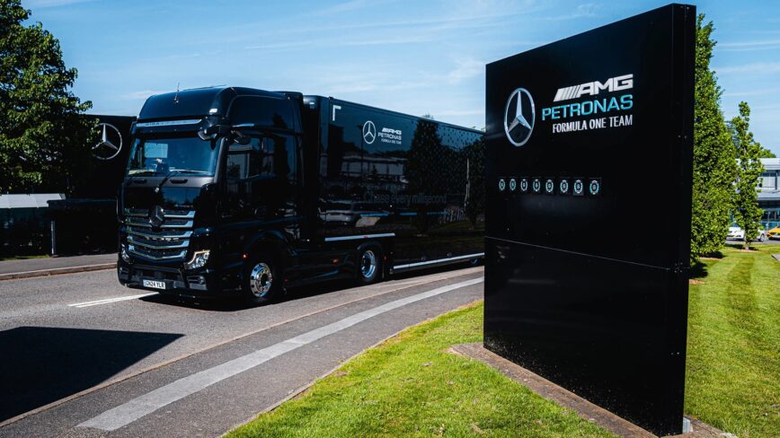O programa de biocombustíveis é complementado pelo uso de camiões elétricos nas operações europeias. Após um teste bem-sucedido no Grande Prémio da Grã-Bretanha de 2025, a Mercedes realizou a sua primeira viagem de longa distância com o Mercedes-Benz eActros 600, transportando os monolugares W16 de Brackley até Zandvoort — uma rota de 673 quilómetros — para o Grande Prémio dos Países Baixos.