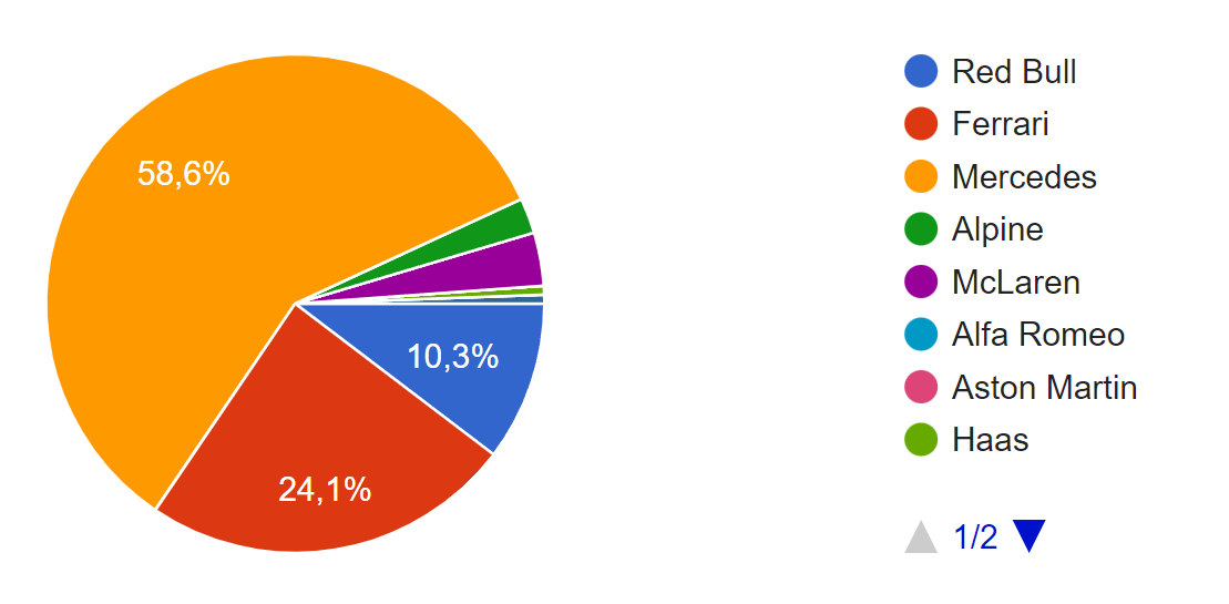 O resultado da sondagem é claro e a Mercedes foi a equipa mais votada com 58.6%. A dupla Lewis Hamilton / George Russell parece ser que os nossos leitores consideram a mais forte, seguido da dupla da Ferrari (24.1%) e a da Red Bull (10.3%). Curiosamente, é a dupla mais jovem da grelha de 2023 a quarta mais votada, com os pilotos McLaren a receberem 3.4%, à frente da dupla da Alpine (2.3%).