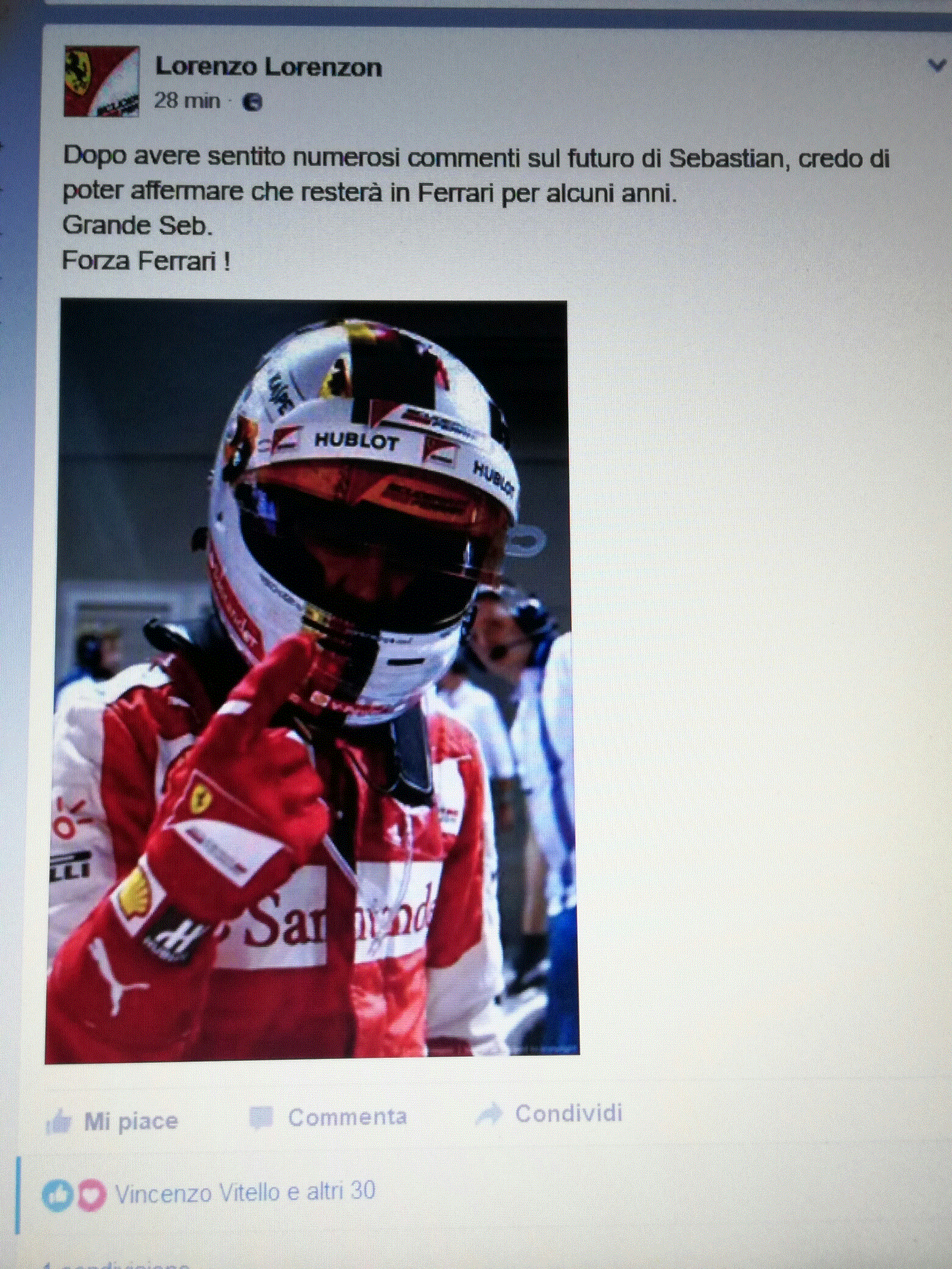 Sebastian Vettel é um dos nomes tem surgido no últimos dias como hipótese para tomar o lugar de Nico Rosberg na Mercedes. Contudo hoje num evento da Ferrari em Daytona, Vettel negou esse cenário. “Não é segredo para ninguém que tanto eu como o Kimi temos contrato para o próximo ano, portanto a questão é clara…”, disse o piloto da marca de Maranello. Em relação à saída do seu compatriota da Mercedes, Vettel considera que todos são “livres de escolher o que pretendem fazer. Respeito a sua decisão e tenho a certeza que vai tirar algum tempo para descansar antes de decidir fazer qualquer coisa”.