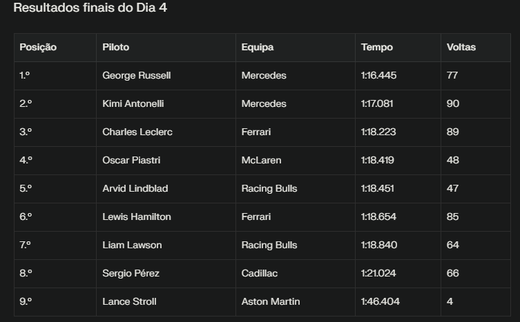 O quarto dia de testes de pré‑época em Barcelona terminou com novo domínio Mercedes, que acumula quilómetros com fiabilidade impressionante, com George Russell a chegar ao segundo 16 nos minutos finais da tarde, superando o registo matinal de Kimi Antonelli e selando mais um dia no topo da tabela de tempos.