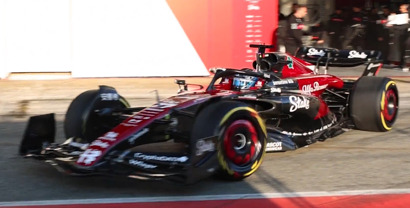 O monolugar da Alfa Romeo para a temporada de 2023 da Fórmula 1 saiu a pista pela primeira vez no ‘shakedown’ da equipa no Circuito de Catalunha-Barcelona. A estrutura suíça revelou uma nova pintura impressionante em vermelho e preto e publicou algumas imagens renderizadas do monolugar, mas o primeiro vislumbre do verdadeiro carro 2023 foi publicado pela Alfa Romeo num pequeno vídeo da saída do carro da garagem para a pista catalã.