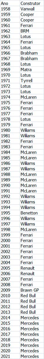 4 – Mercedes (2014, 2015, 2016, 2017, 2018, 2019, 2020, 2021), 8 no total