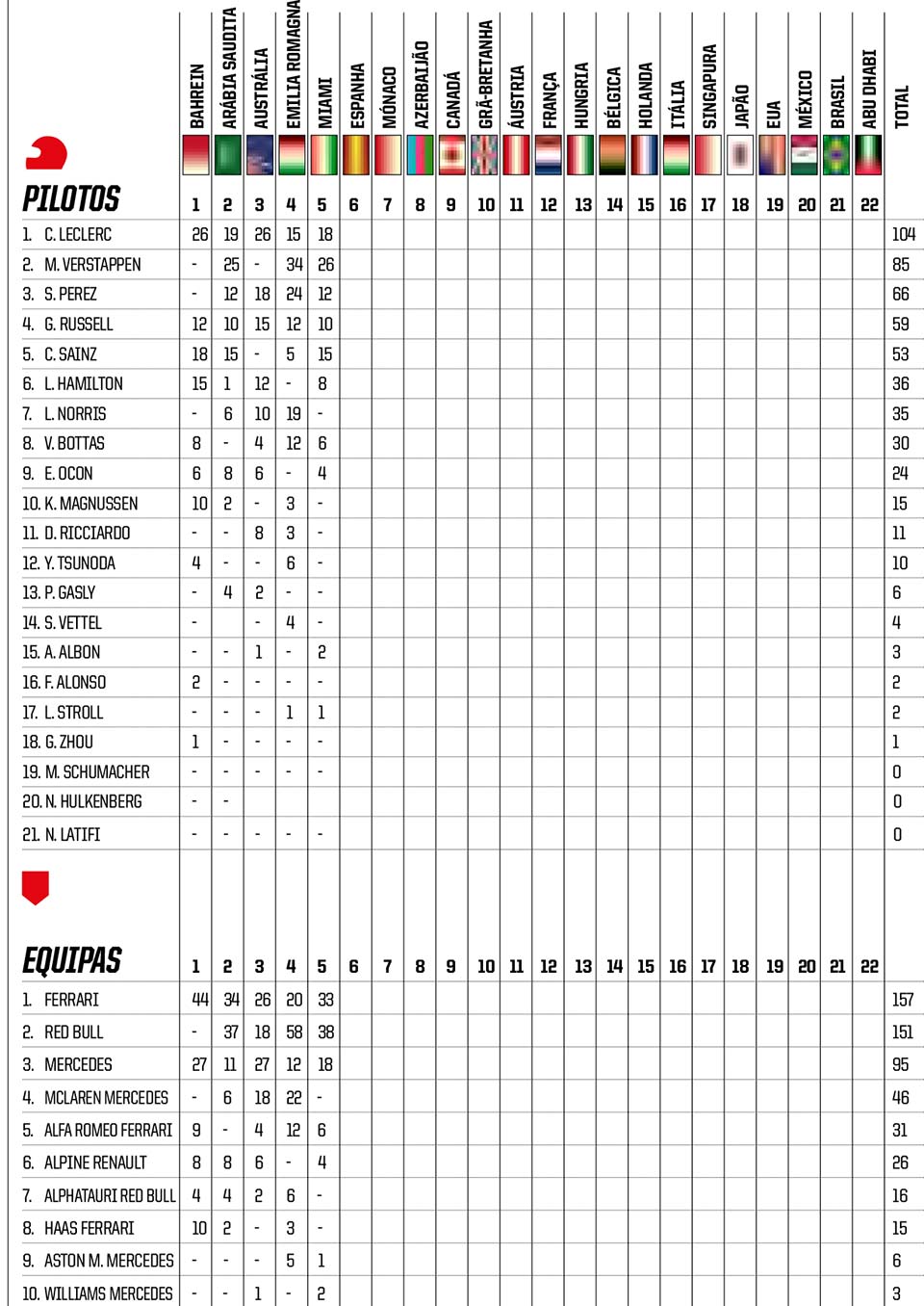 A Mercedes continua a perder terreno para a Ferrari e Red Bull, mas está em ‘terra de ninguém’ em terceiro lugar, a uma distância tão longa para a frente como para trás, já que a McLaren esteve muito em baixo nos EUA, não pontuando. Positiva continua a ser a prestação da alfa romeo, que se posiciona na frente da Alpine e Alpha Tauri enquanto a Haas já tem mais do dobro dos pontos da Aston Martin, para não falar da Williams, últimas da lista.