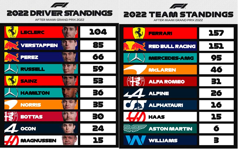 Com o seu terceiro triunfo do ano em cinco corridas, Max Verstappen reduziu para 19 pontos a distância que o separa do líder do campeonato, Charles Lelerc. Tendo em conta o que se viu nestes últimas duas corridas, parece claro que a Red Bull está mais forte que a Ferrari, que terá de encontrar um antídoto para voltar às lutas com outros argumentos, que claramente não teve em Miami.
