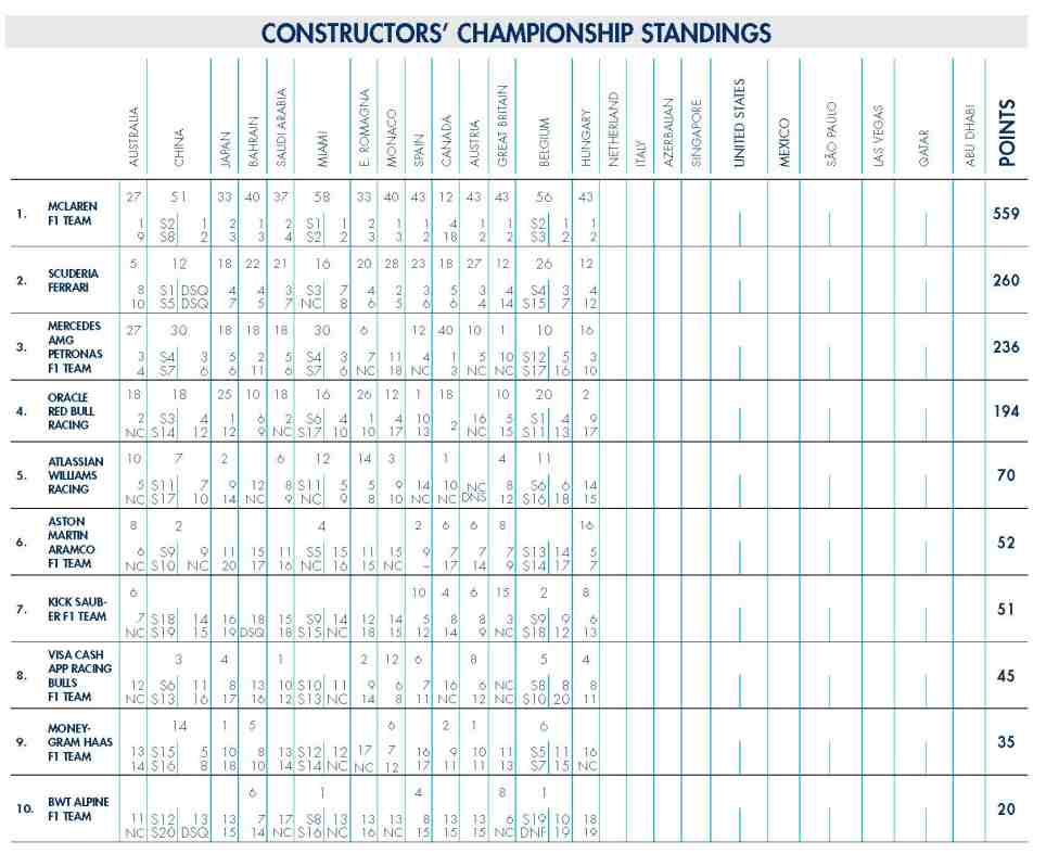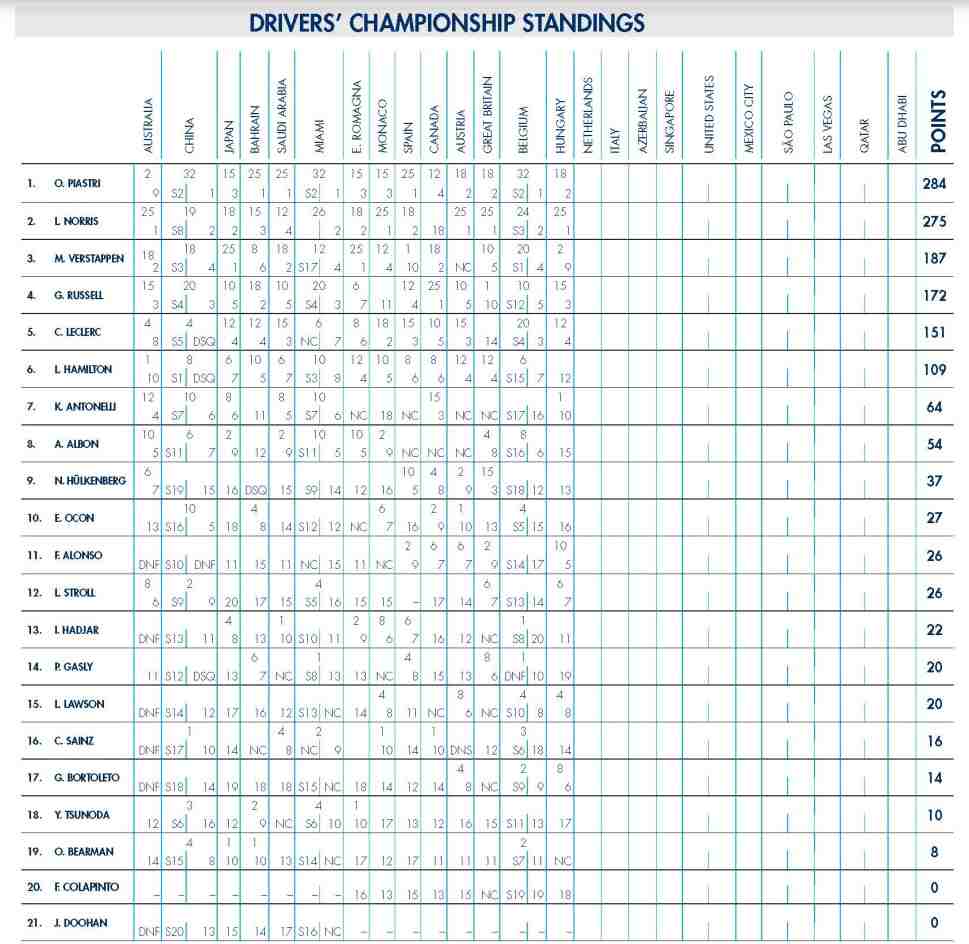 Faltando agora 10 corridas para o final do ano, as classificações de Pilotos e Construtores estão bastante equilibradas entre os dois pilotos da McLaren, com Oscar Piastri nove pontos na frente de Lando Norris, e a McLaren-Mercedes a dominar fortemente nos construtores, com mais do dobro dos pontos da Ferrari.