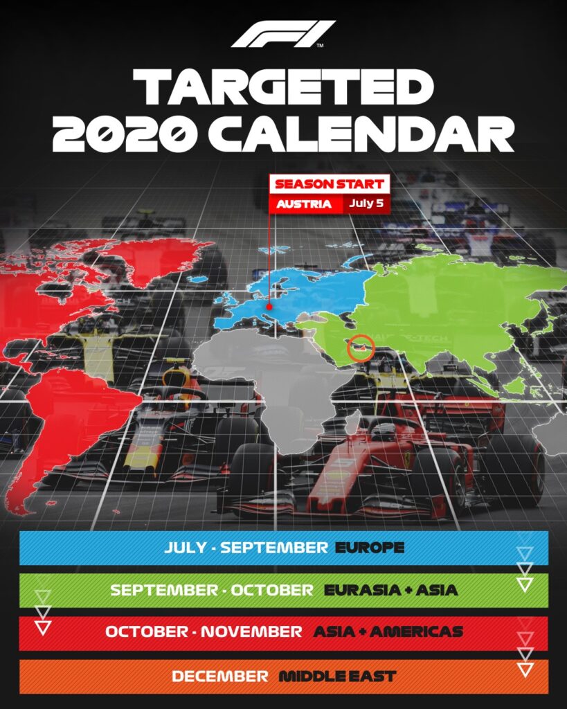 Pelo caminho já ficaram os Grandes Prémios da Austrália, Mónaco e Paul Ricard, que foram cancelados, com o Bahrein, Vietname, China, Holanda, Espanha, Azerbaijão e Canadá, adiados. A ideia de Chase Carey e da Liberty Media passa por realizar entre 15 e 18 corridas, as primeiras à porta fechada, começando com o Grande Prémio da Áustria de F1 no dia 5 de julho, à porta fechada, com um número de pessoas muito reduzido no paddock de modo a cumprir as restrições que estejam em vigor.