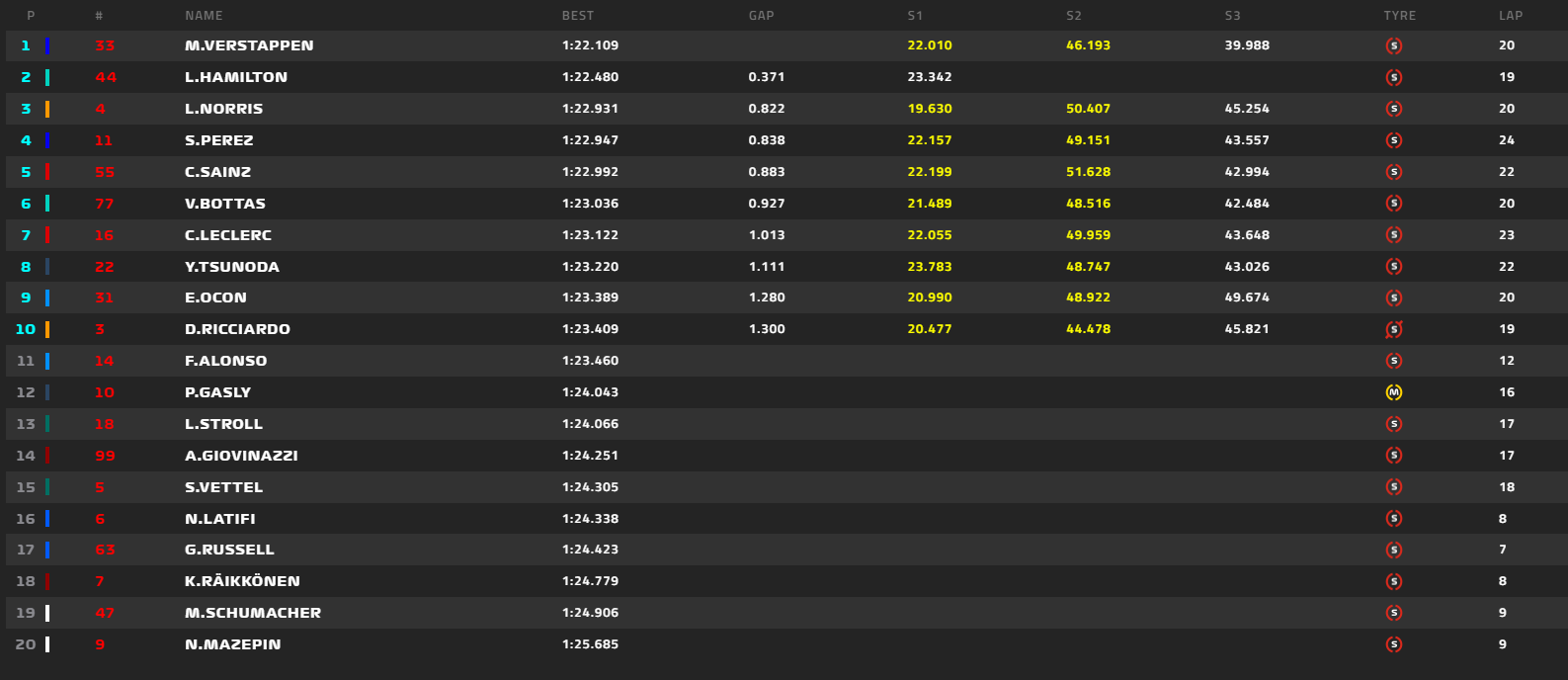 Os carros saíram para as derradeiras voltas do dia, em busca do melhor lugar possível no top 10 da grelha de amanhã Os Mercedes saíram em primeiro lugar, para evitar os problemas de trânsito (Hamilton não queria o cone de aspiração de Bottas). No entanto, o tempo de Hamilton não foi o suficiente para destronar Verstappen, numa volta abaixo do esperado para o piloto da Mercedes. Verstappen conseguiu assegurar a pole, numa pista que parecia sorrir à Mercedes e onde os Flechas de Prata foram ligeiramente melhores até a qualificação. Lando Norris fez o terceiro melhor tempo, em mais uma excelente prestação do piloto da McLaren, isto depois de um período mais cinzento nas últimas corridas. Seguiram-se Pérez, Sainz a fechar o top 5, com Bottas, Leclerc, Tsunoda, Ocon e Ricciardo a completar o top10.