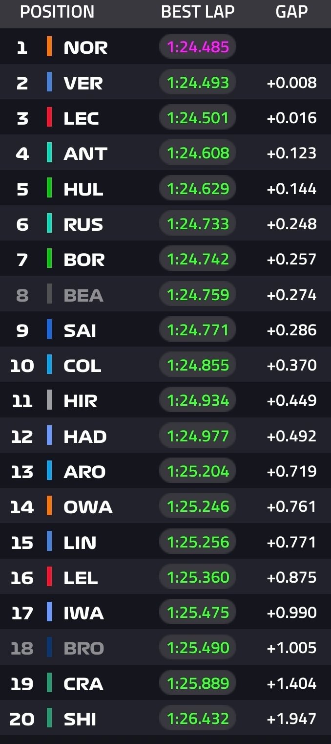A sessão chegou ao fim sem grandes motivos de destaque. Lando Norris ficou com o melhor tempo (1:24.485), seguido de Max Verstappen (que se queixou de problemas no carro) e Charles Leclerc (que pareceu chocado com a falta de ritmo em simulação de corrida). Kimi Antonelli ficou com o quarto tempo e Nico Hulkenberg fechou o top 5. O melhor dos estreantes foi Ryo Hirakawa, em 11º, com Aron em 13º, O´Ward em 14º, Lindblad em 15º, Arthur Lelerc em 16º, Iwasa em 17º, Browning em 19 e a dupla da Aston Martin no fundo da tabela de tempos.