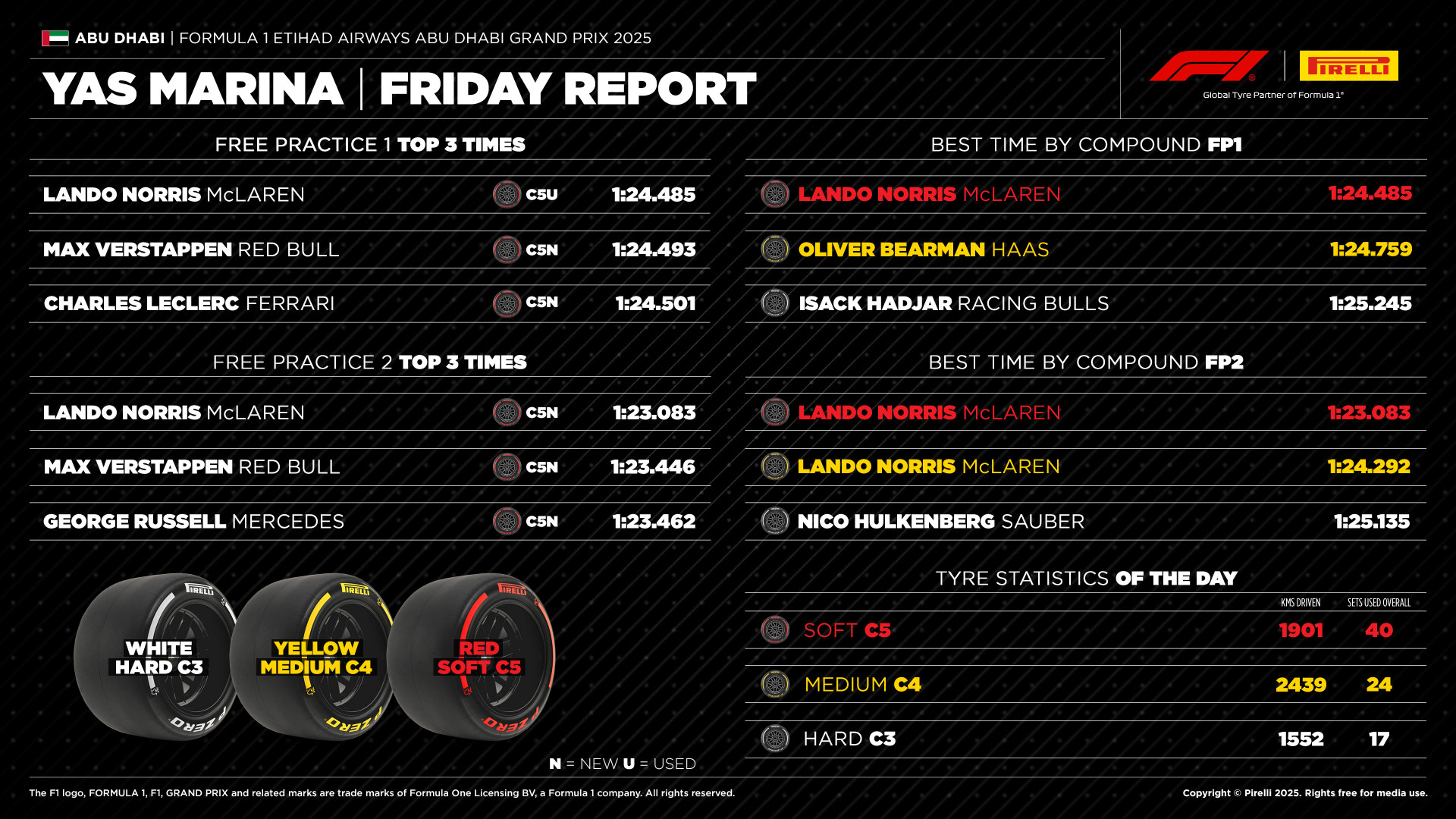 Lando Norris assumiu a liderança no primeiro dia de treinos livres para a decisão do título em Abu Dhabi, sendo o mais rápido em ambas as sessões com pneus macios. O piloto da McLaren impôs-se tanto nas condições mais quentes da primeira sessão como na segunda, mais representativa da qualificação e da corrida, deixando claro o potencial do MCL38. Max Verstappen foi o rival mais próximo, mas a vantagem de Norris na segunda sessão cifrou-se em três décimos, num dia em que Oscar Piastri, impedido de rodar na FP1 para ceder o lugar a Pato O’Ward, terminou apenas em 11.º no TL2.