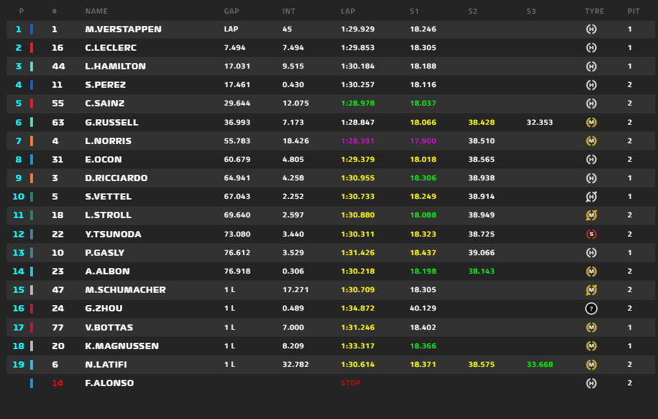 Nesta fase da corrida a Red Bull está a tentar esticar os pneus de Verstappen, Leclerc tem a ameaça de Pérez (muito mais rápido com pneus novos) e em terceiro, Hamilton também tenta esticar este stint, pouco convicto da estratégia. Sergio Pérez ataca Hamilton pelo terceiro lugar com o mexicano a querer chegar a Leclerc.