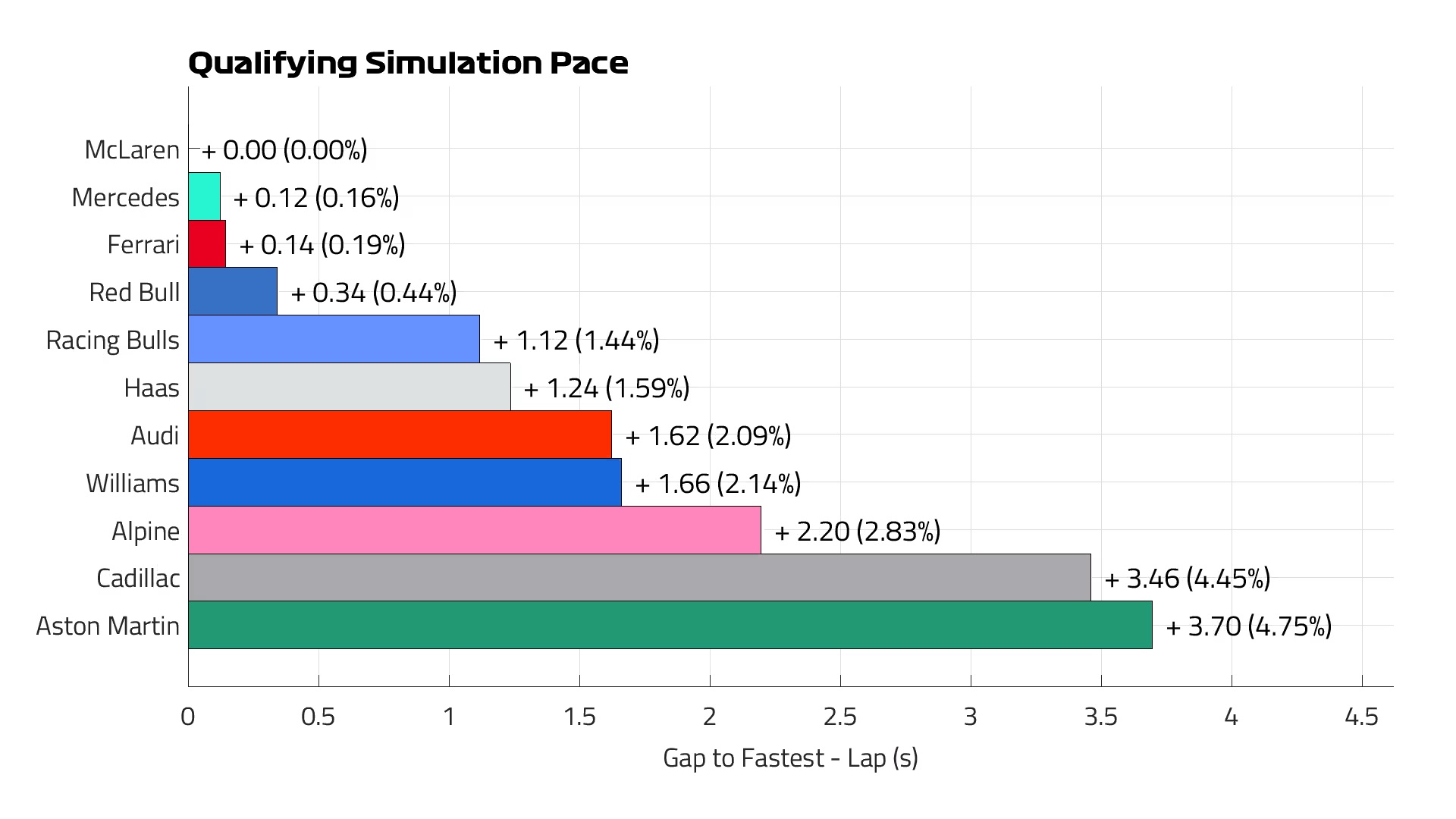 De acordo com os dados recolhidos nas simulações de qualificação e corrida, a McLaren surge como a referência inicial, seguida de Mercedes e Ferrari, com a Red Bull ligeiramente atrás — embora as equipas ainda tenham margem significativa para evoluir antes da qualificação.