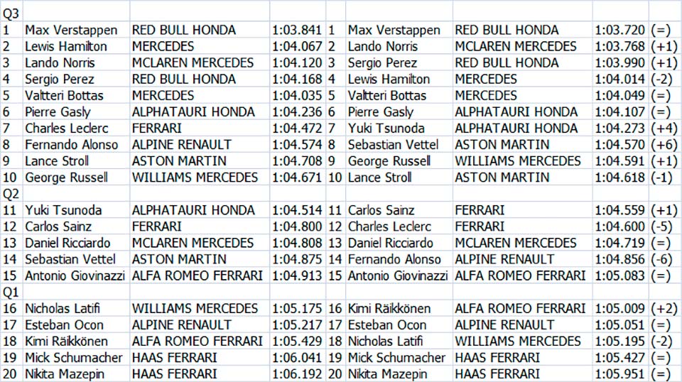 Como curiosidade, oito dos 20 pilotos fizeram esta semana exatamente a mesma posição na grelha da semana passada, entre eles o autor da pole, Max Verstappen. Sete melhoraram, cinco pioraram.