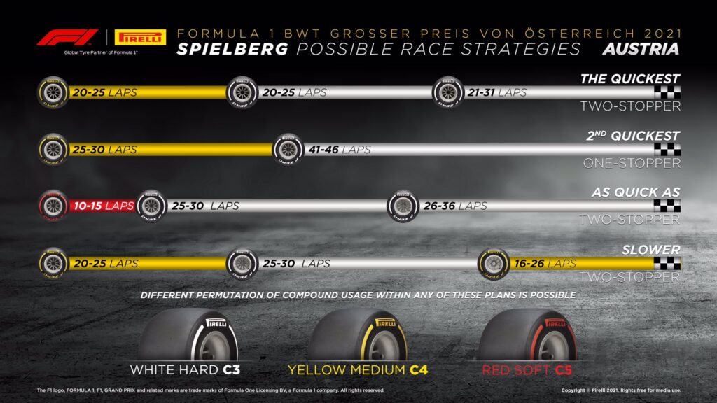 A Pirelli deu a conhecer a sua previsão das possíveis estratégias para a corrida de logo do GP da Áustria. Segundo o fornecedor de pneumáticos, a estratégia de apenas uma paragem, que foi a mais comum na corrida passada no mesmo circuito, será mais lenta que duas paragens.