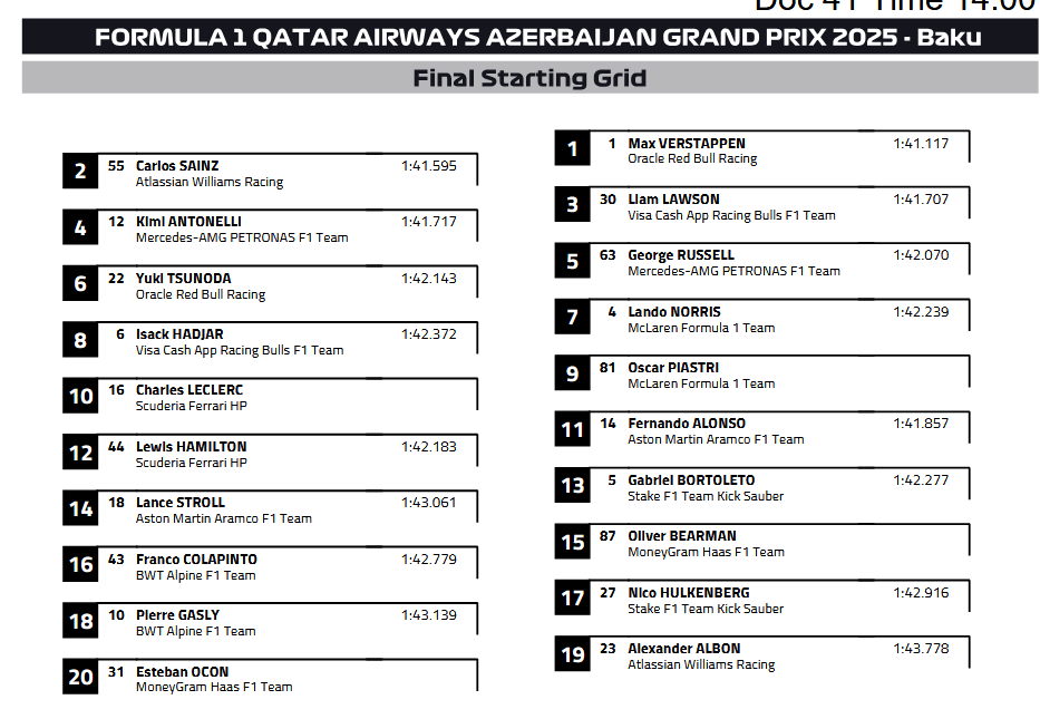 Eis a grelha de partida final para o GP do Azerbaijão. Max Verstappen larga da pole, acompanhado de Carlos Sainz na primeira linha. Liam Lawson e Kimi Antonelli completam a segunda linha, à frente de Yuki Tsunoda e George Russell. Lando Norris está em sétimo, à frente de Isack Hadjar, com Oscar Piastri e Charles Leclerc a completarem o top 10.