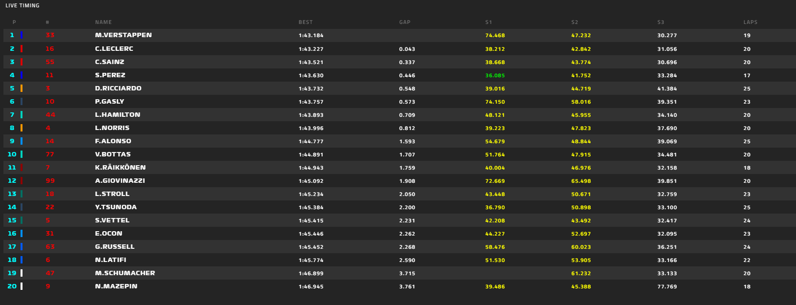 Não vimos mais mudanças na tabela de tempos e Verstappen manteve-se como o mais rápido da sessão. Seguiram-se os dois Ferrari (boa sessão de treino), Pérez e Ricciardo a fechar o top 5 (bom para a moral do australiano, com Norris em oitavo). A Mercedes foi discreta na segunda metade da sessão e nunca esteve perto dos tempos da frente, o que para já levanta apenas mais dúvidas e não pode ser considerado um indicador forte para o resto do fim de semana.