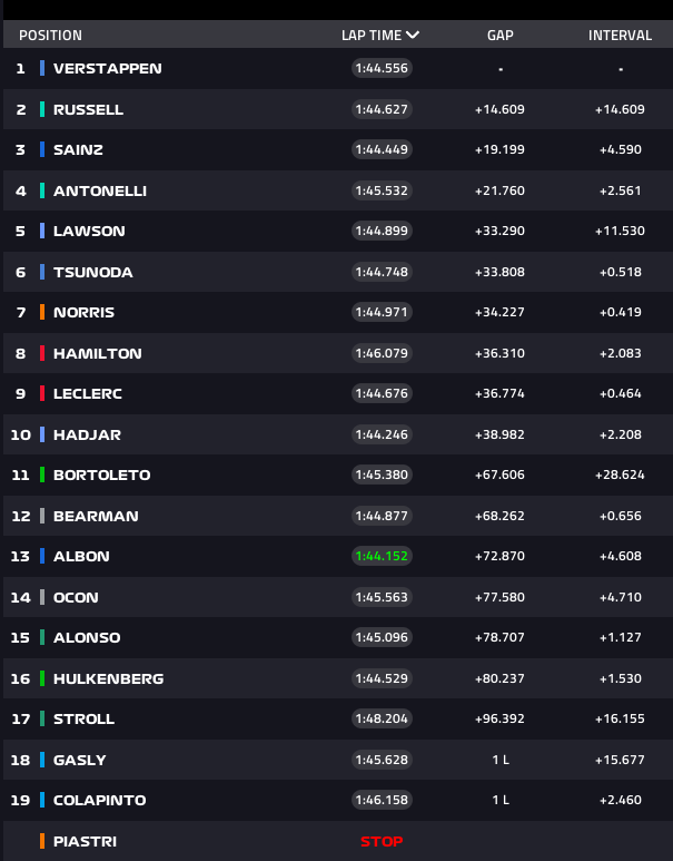 A ordem era Verstappen, com 32 segundos de vantagem, Russell, Sainz, Antonelli, Lawson, Tsunoda, Leclerc, Norris, Hamilton e Hadjar. Faltavam 12 voltas para o fim.