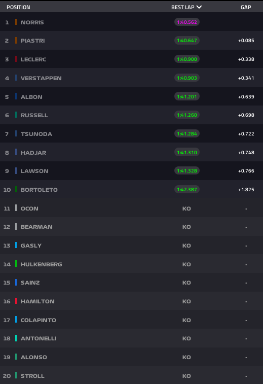 Entre os que passaram à Q3 e garantiram um lugar no top 10, destacam-se, sem surpresa, os dois carros da McLaren e os dois da Red Bull, o que representa uma excelente notícia para a equipa. Um Mercedes e um Ferrari também asseguraram a sua presença. A maior surpresa foi a qualificação dos dois Racing Bulls, com Gabriel Bortoleto e Alex Albon, que também garantiram um lugar no top 10. Em contraste com as oito equipas que marcaram presença no top 10 na véspera, hoje apenas sete equipas conseguiram esse feito.