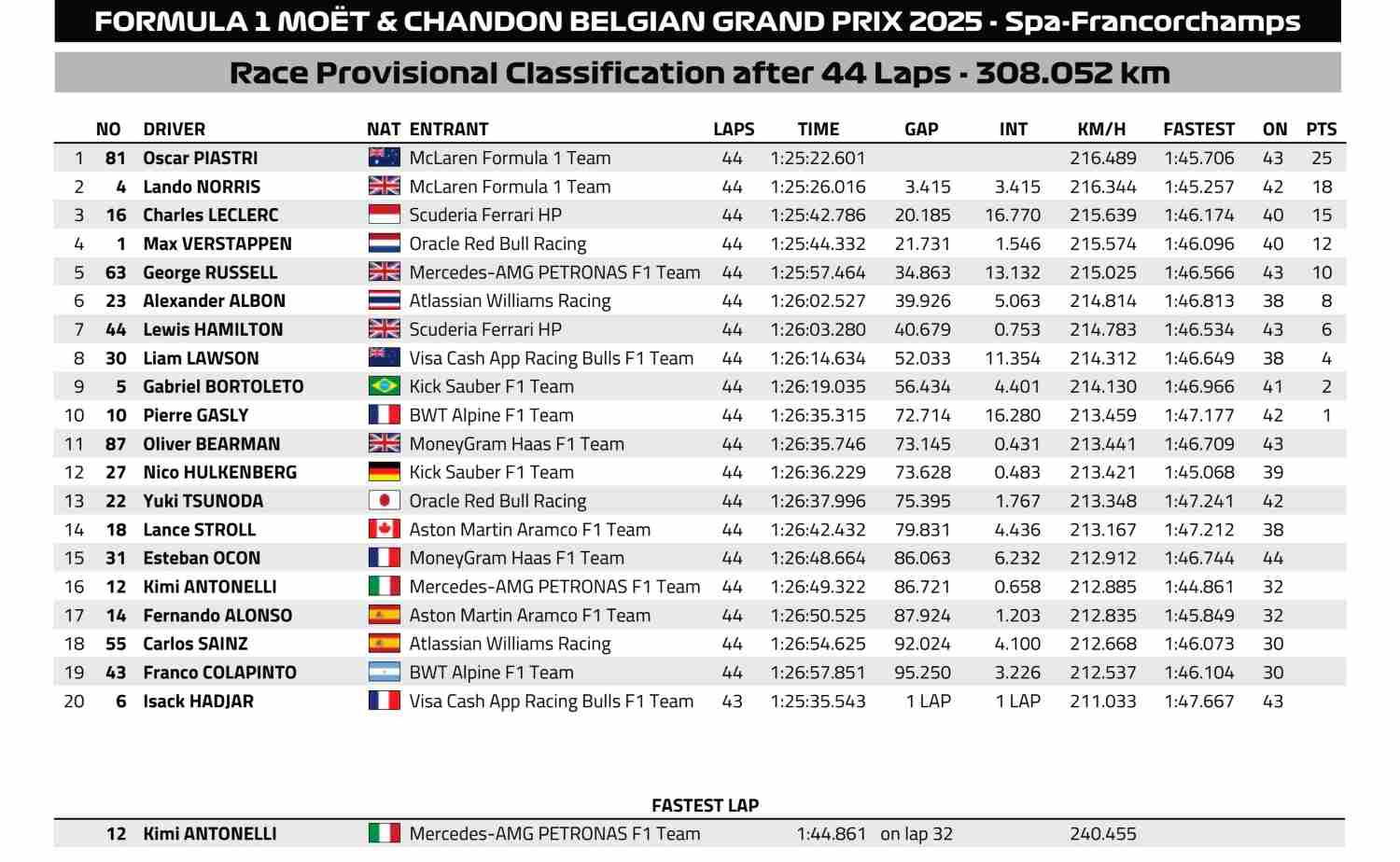 Lando Norris, que partiu da pole position, viu a sua corrida comprometida por um aparente problema de bateria durante a fase de Safety Car. Esta falha impediu-o de reagir a Oscar Piastri na reta de Kemmel, onde foi prontamente ultrapassado pelo australiano.