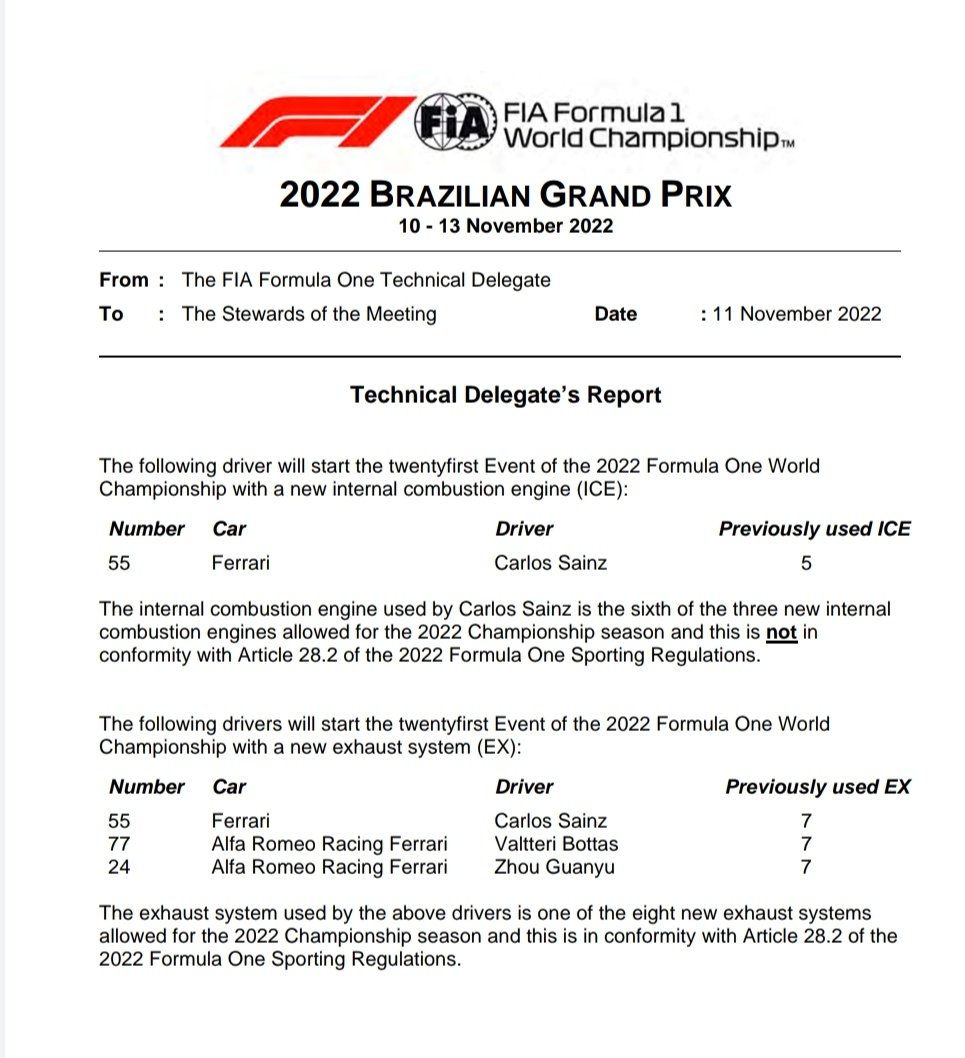A Ferrari mudou o motor de combustão interna do monolugar de Carlos Sainz, alterando esse componente para a nova atualização que já é utilizada por Charles Leclerc. Como não é um componente novo e ultrapassa o número máximo permitido para todo a época, Sainz será penalizado em pelo menos cinco lugares na grelha de partida para a corrida de domingo.