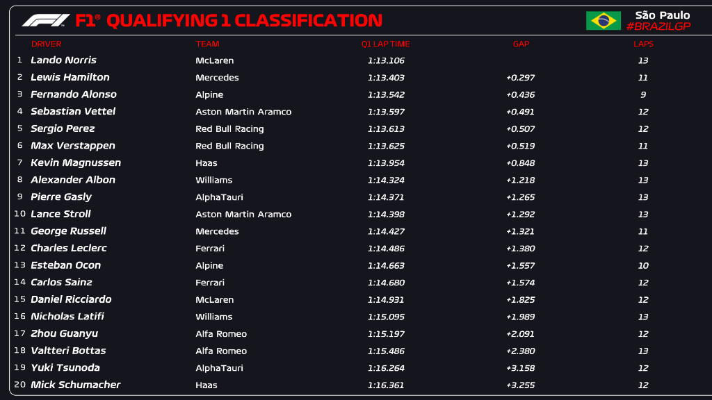 Max Verstappen passou pela liderança da tabela de tempos, mas ficou a 0.099s do tempo que Lando Norris estabeleceu pouco metros atrás. O piloto britânico terminou a volta em 1:11.571s sendo este o tempo de referência da Q2.