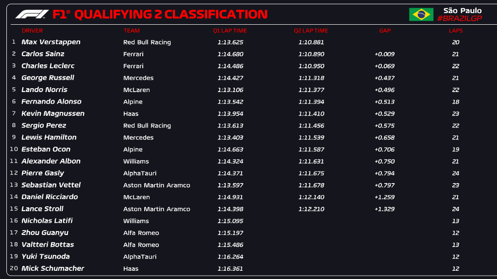 Max Verstappen, ainda na sua primeira volta rápida, colocou-se no topo da tabela de tempos, com 1:18.495s, sem marcar o melhor registo em nenhum dos três setores da pista brasileira. Este tempo foi batido por Fernando Alonso, baixando o tempo de referência em 1:18.412s, numa altura em que a pista estava mais seca e com isso os tempos iam caindo.