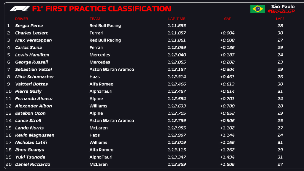 GP Brasil F1, TL1: Sergio Pérez foi o mais rápido, mas diferenças entre primeiros são curtas