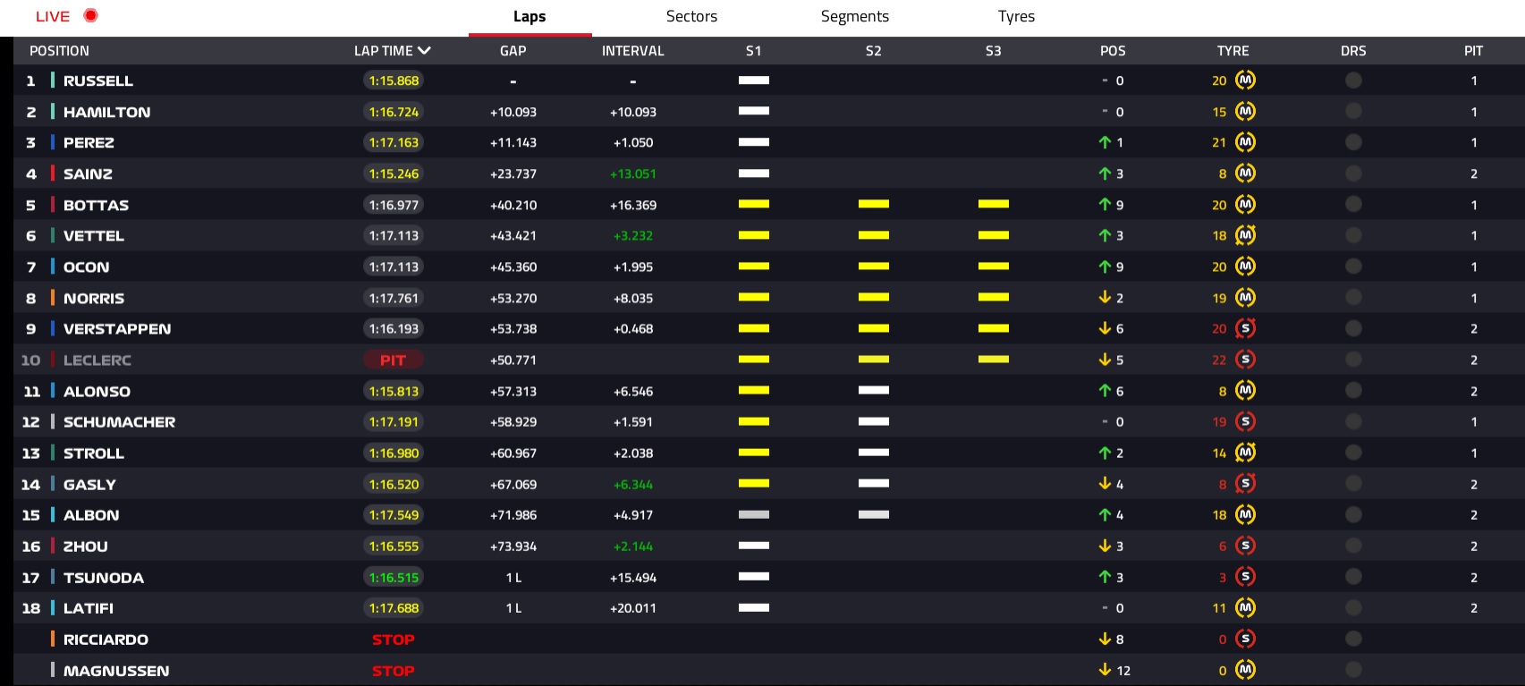 Quem vinha a fazer uma boa recuperação era Valtteri Bottas, que era já 6º classificado após as primeiras 20 voltas. Nessa altura, com mais de 3s para o segundo classificado, George Russell seguia na liderança do pelotão e pedia à equipa para estender o seu stint com pneus macios. Lewis Hamilton, que tinha já subido ao terceiro lugar, estava a tentar recuperar terreno para Sergio Pérez.