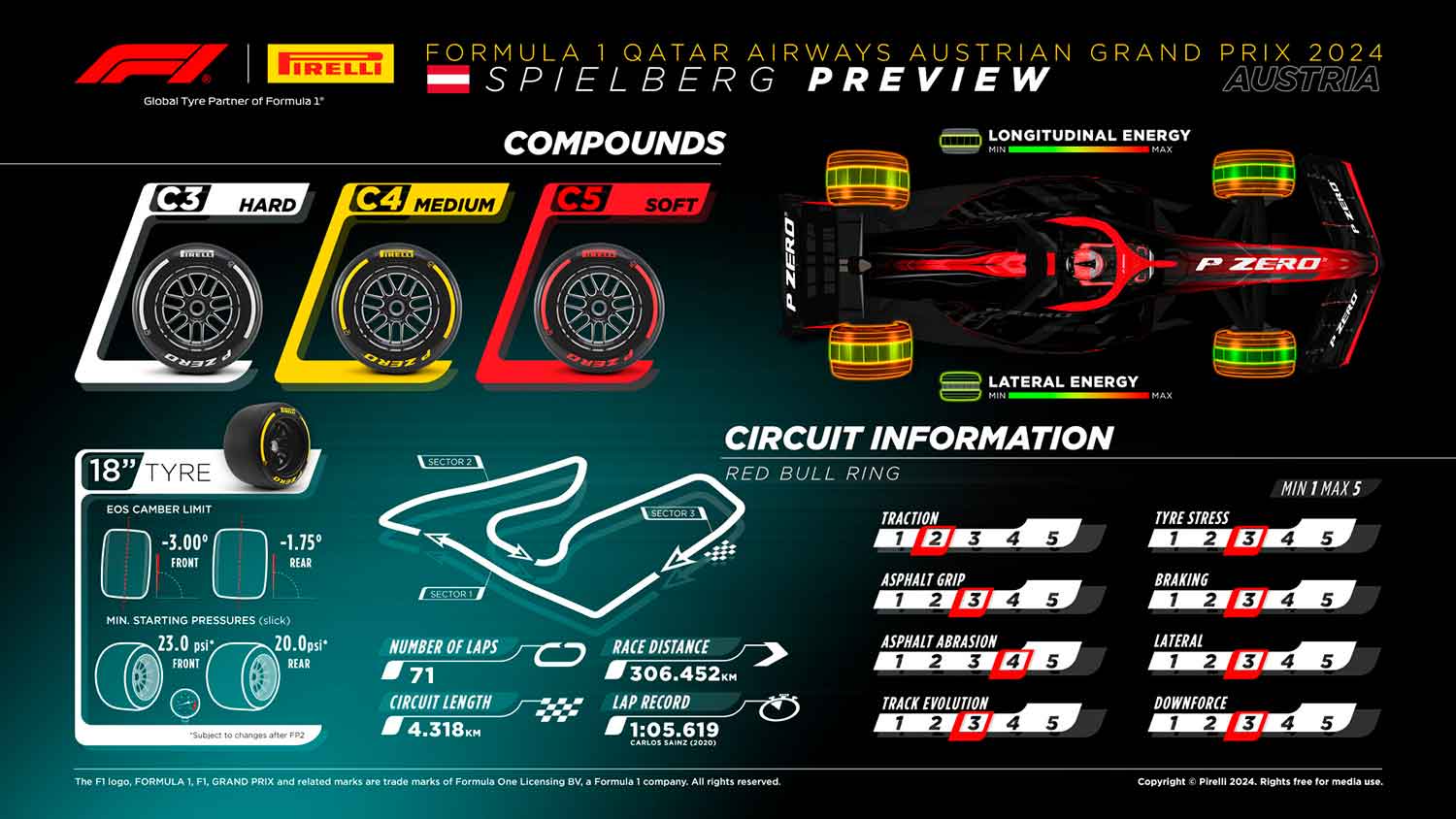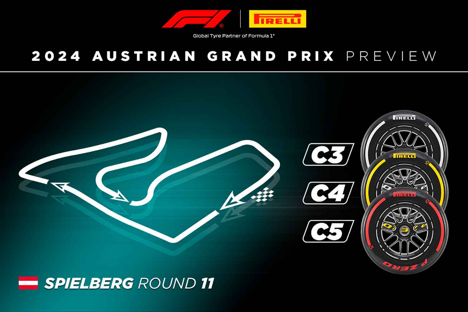 Como é habitual, a Pirelli escolheu os três compostos mais macios da gama de 2024 para este evento: C3 (Duro), C4 (Médio) e C5 (Macio). A superfície do circuito de Spielberg é bastante antiga e abrasiva, mas as forças laterais exercidas sobre os pneus são menores do que a média, resultando num desgaste limitado. A tração nas saídas das curvas lentas e a estabilidade nas travagens são cruciais para ser competitivo.