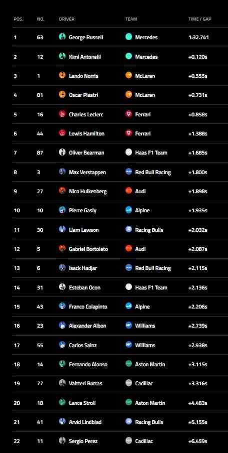 Ollie Bearman destacou‑se com um sétimo tempo para a Haas, batendo Max Verstappen (Red Bull), Nico Hülkenberg (Audi) e Pierre Gasly (Alpine), que fecharam o top 10. Liam Lawson (Racing Bulls) foi 11.º, seguido de Gabriel Bortoleto (Audi), Hadjar, Esteban Ocon (Haas) e Colapinto. A Williams teve uma sessão discreta, com Alex Albon e Sainz em 16.º e 17.º, enquanto Fernando Alonso e Lance Stroll colocaram os Aston Martin em 18.º e 20.º, separados pelo Cadillac de Valtteri Bottas. Sergio Pérez, no outro Cadillac, encerrou a classificação.