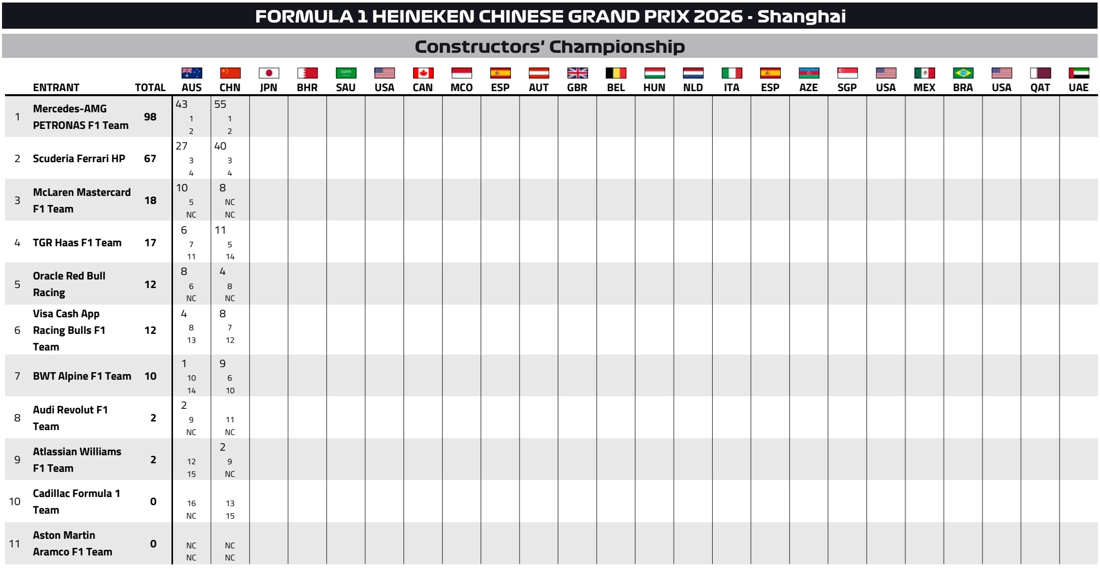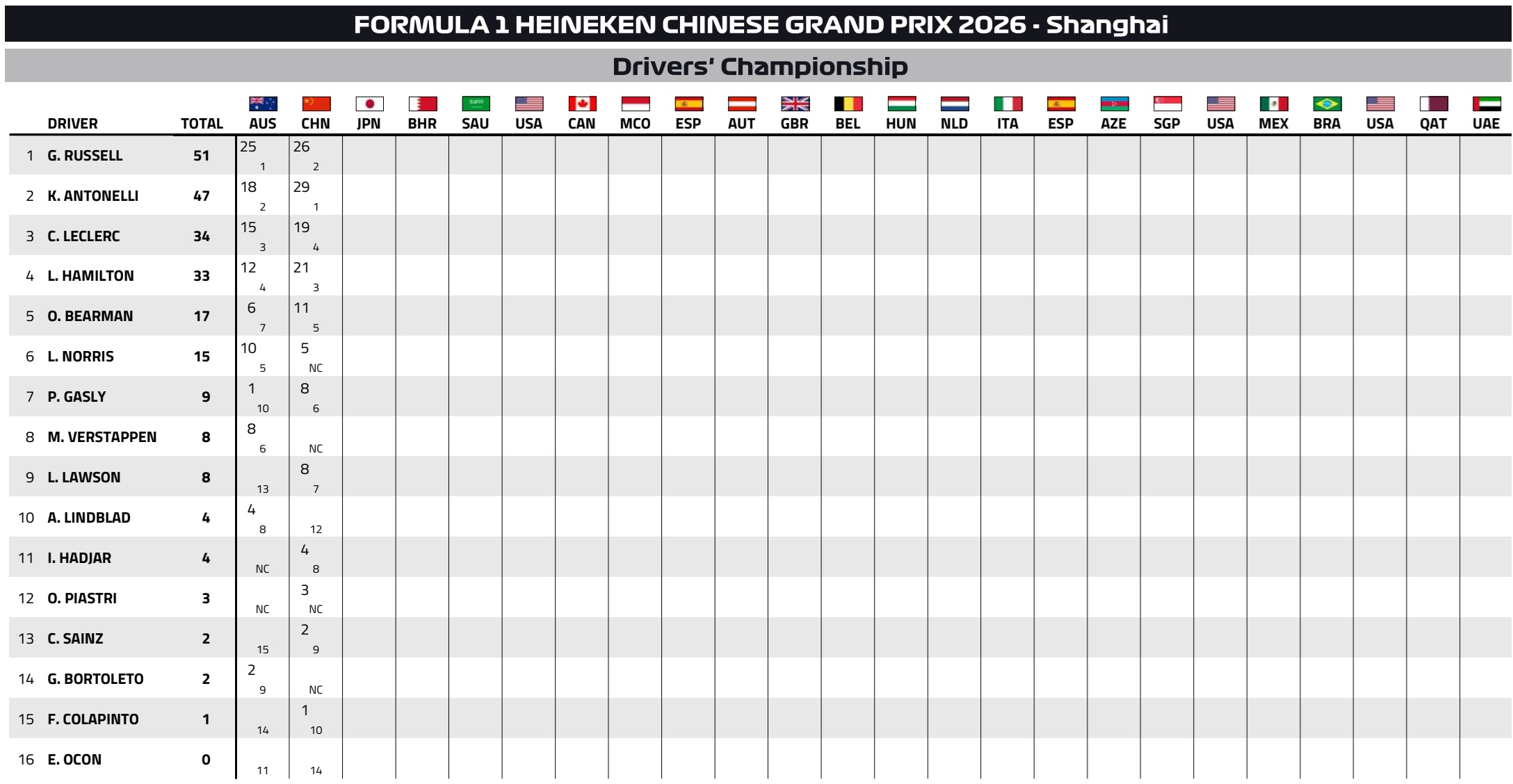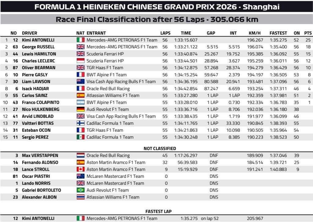 Depois da vitória de Kimi Antonelli no GP da China, com nova dobradinha da Mercedes, a 62ª da história da equipa, o cenário na classificação dos pilotos manteve-se semelhante.