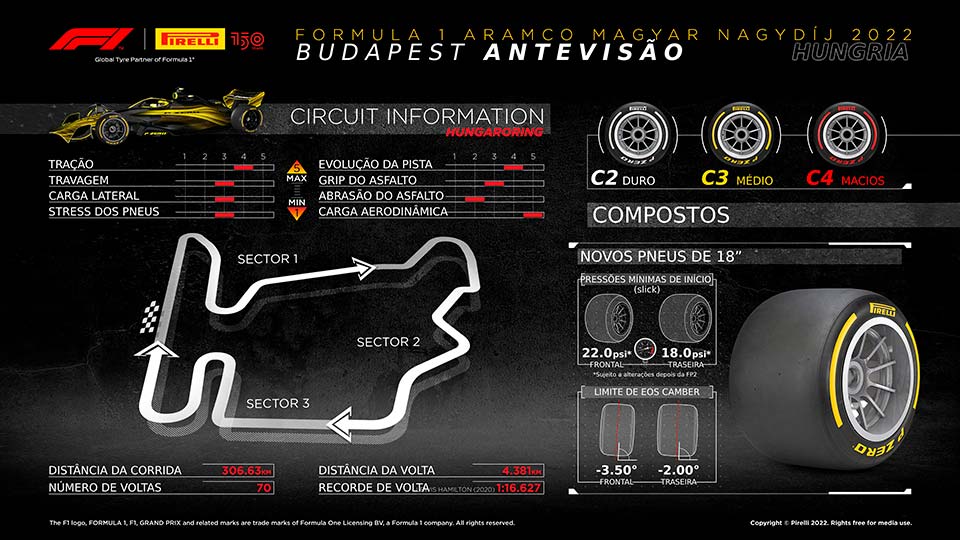 O Grande Prémio da Hungria assinala o fim da primeira metade do ano, antes da paragem de verão. Para esta corrida, a Pirelli escolheu os pneus intermédios da game de F1: C2 (duros), C3 (médios), C4 (macios).